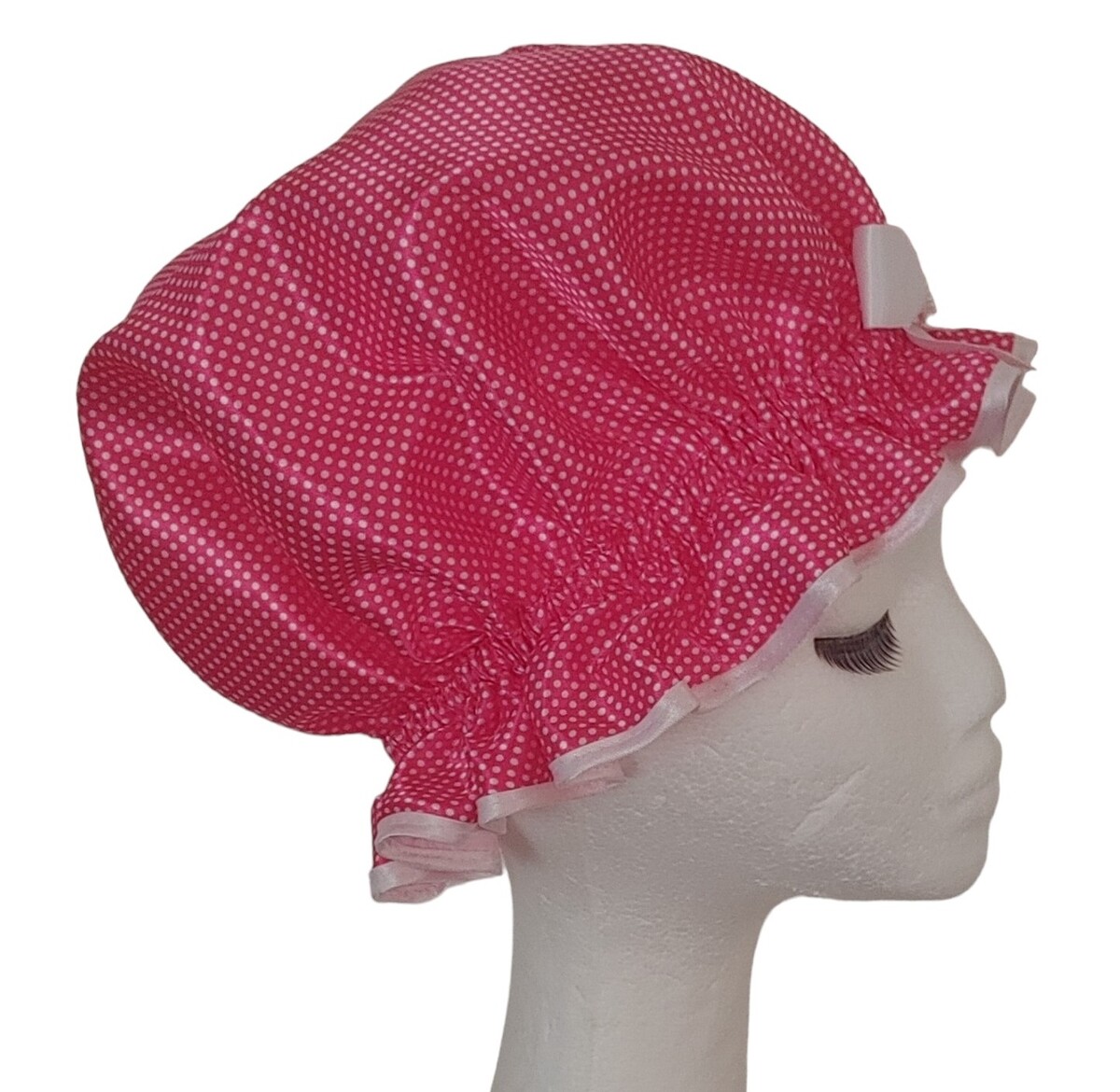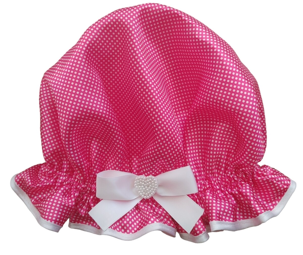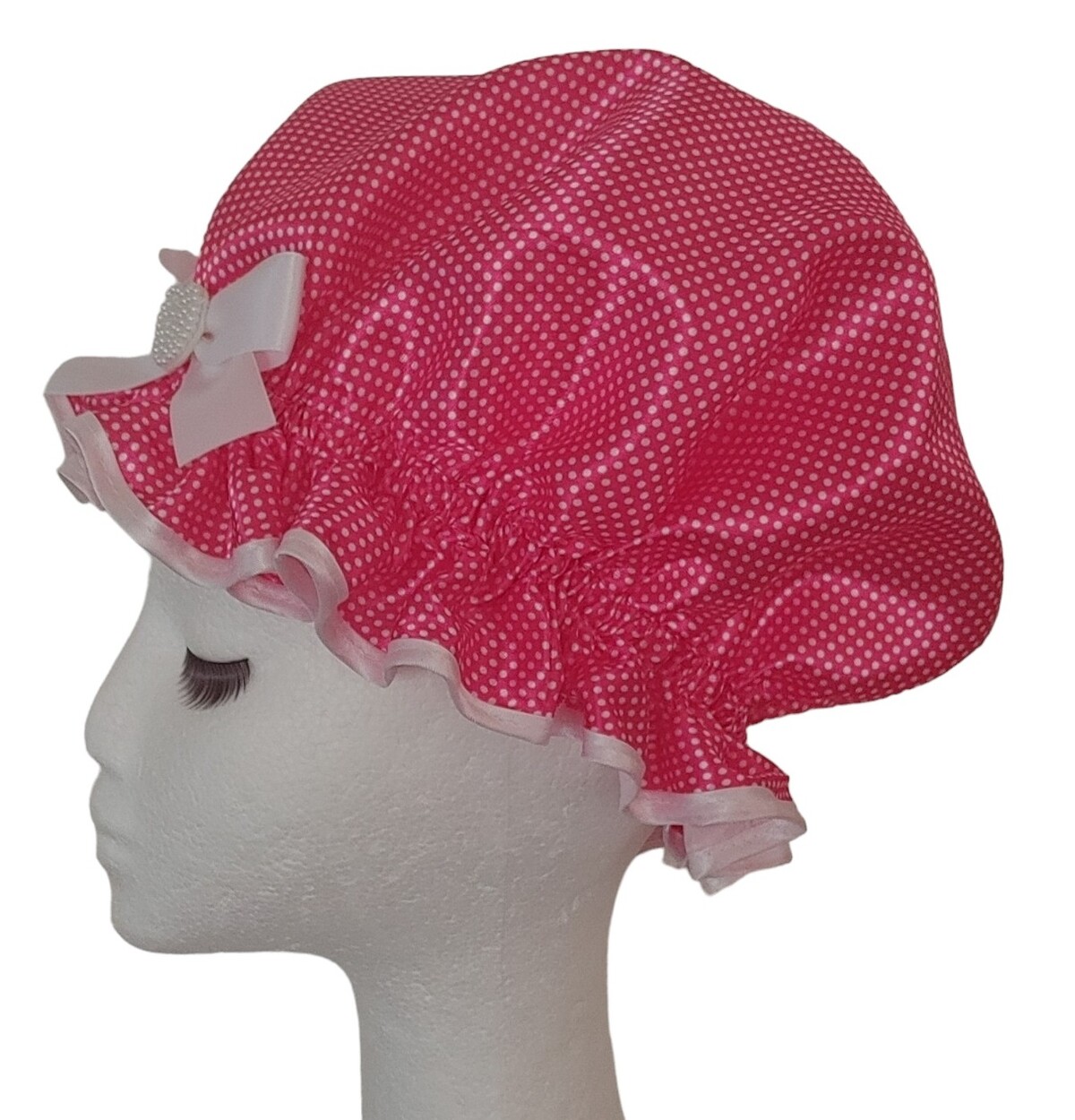 Such a cute design, this So Pretty Satin shower cap in Hot Pink with fine White polka dots. If there was to be a shower cap that Barbie would wear, this would have to be the one don’t you think? Particularly as all So Pretty shower caps are bouffant style to accommodate long hair, so quite appropriate in that respect. Keeping the embellishment just so with a beaded White heart adds to its simplicity and appeal.