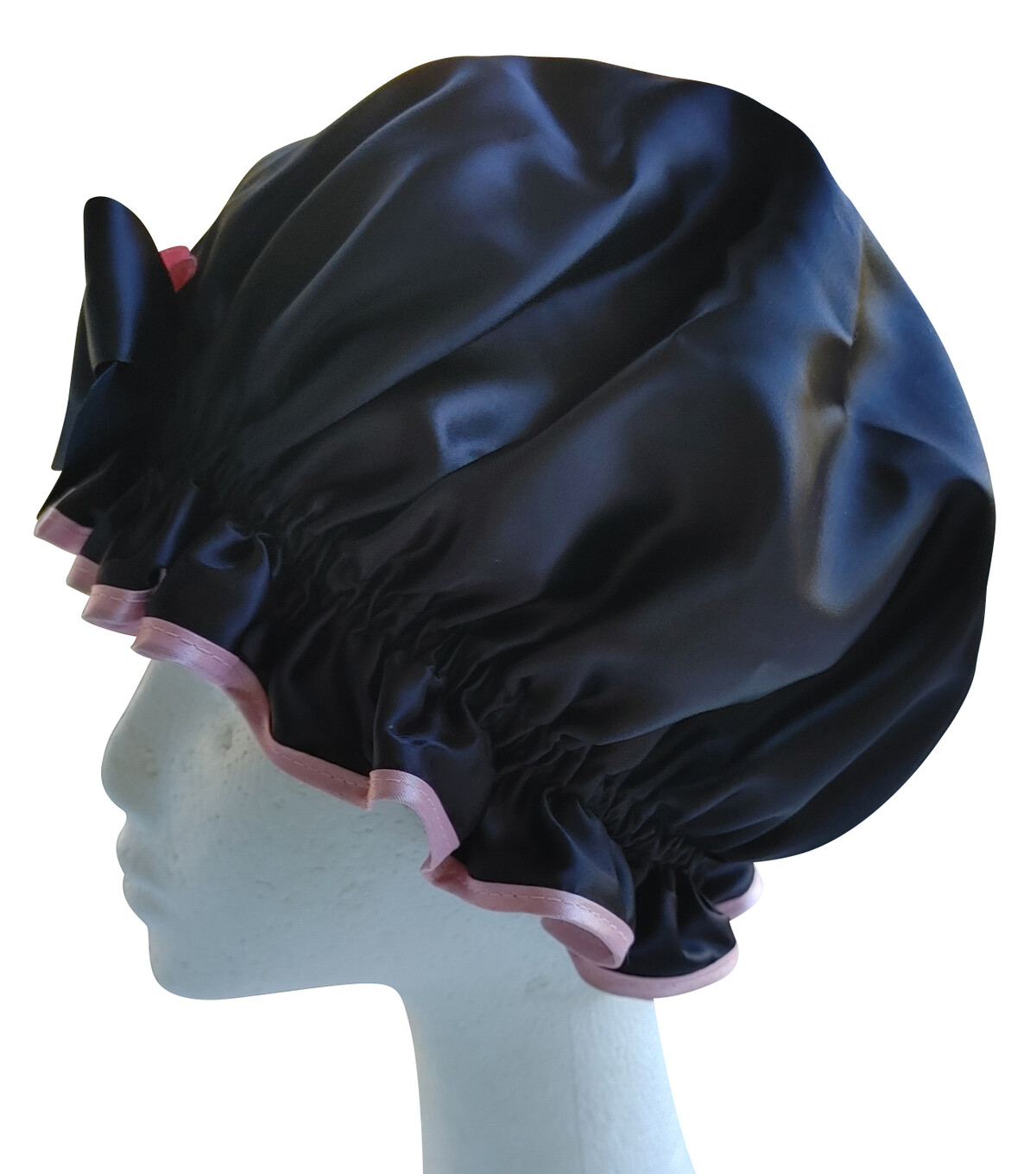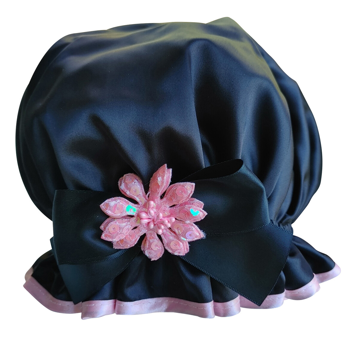 The Black Satin ribbon used is of extra width from which a double bow is created and combined with a larger than usual sequinned flower trim. The edging is quality Satin in each respective colour. All this creates the flair that is the Big Bow Pizazz shower cap!