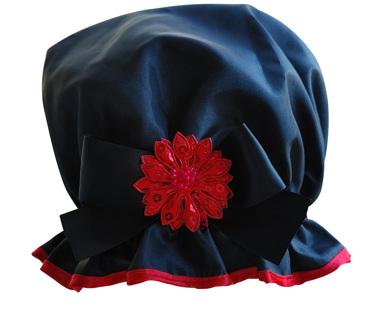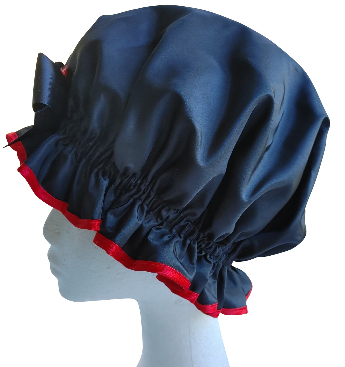 The Black Satin ribbon used is of extra width from which a double bow is created and combined with a larger than usual sequinned flower trim. The edging is quality Satin in each respective colour. All this creates the flair that is the Big Bow Pizazz shower cap!