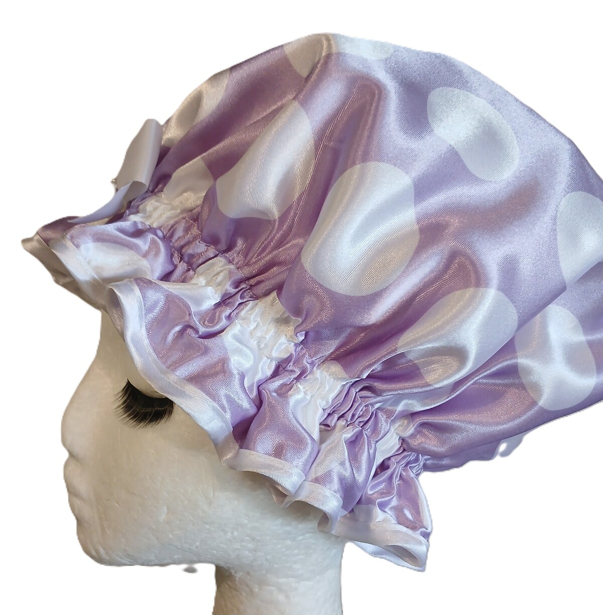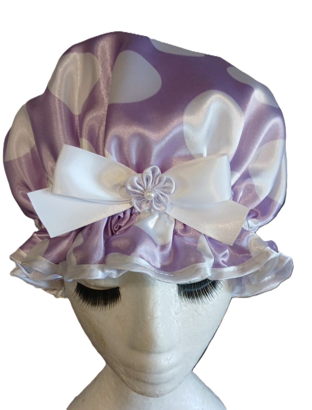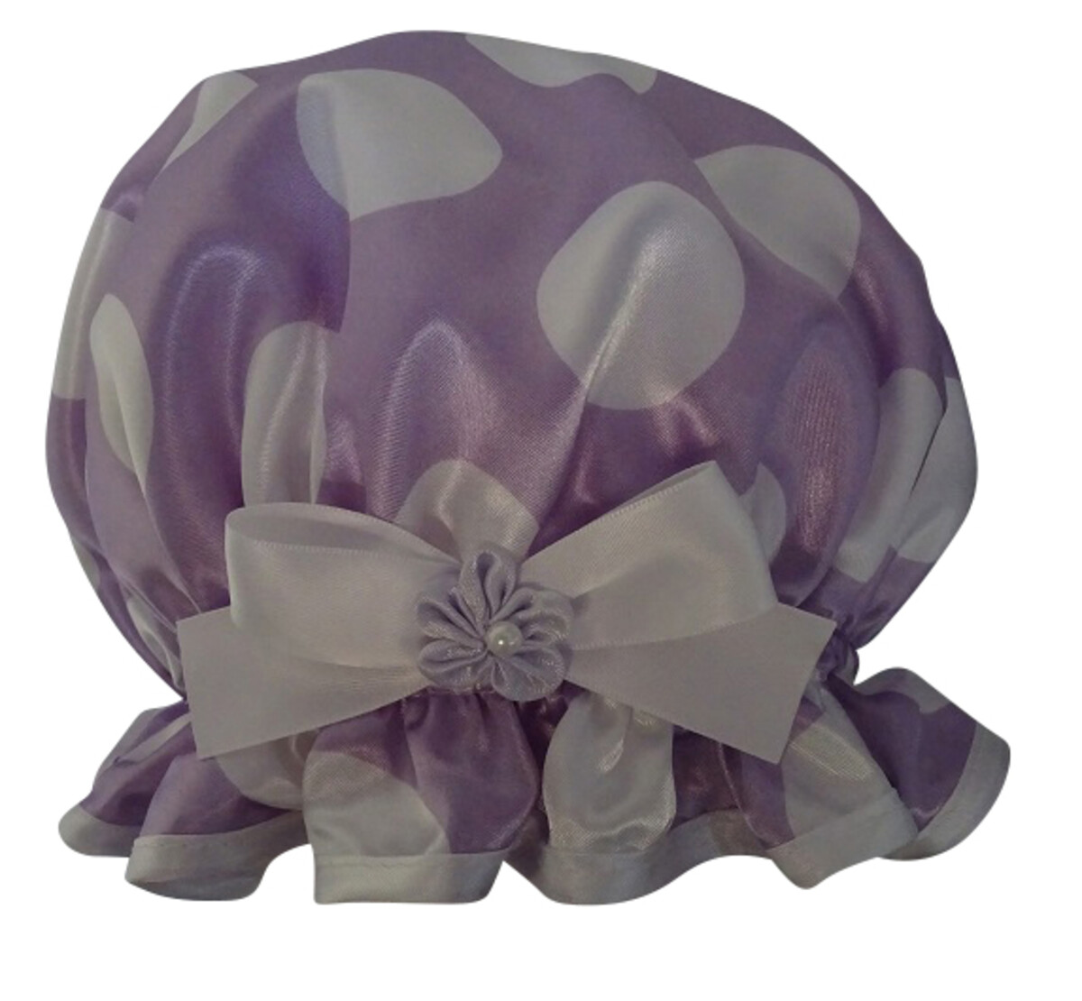 So Pretty Shower Caps Big Dot Lilac shower cap is bold but not TOO bold! The boldness comes with the extra large White polka dots on this Satin print. The Lilac is that pastel shade of purple that envisages relaxation mainly since Lavender is a similar colour and Lavender smells divine! Lavender scent is often used for aromatherapy and to create a relaxing environment, whether it be by using oil burners, misters, drawer sachets or pillow sprays. Oh and don’t forget Lavender soap, so many quality soaps are out there that are hand made with love, just as a So Pretty Shower Cap is! As a result the Big Dot Lilac shower cap achieves a sense of relaxation and toned down glamour (after all, it is a stylish shower cap by So Pretty!). This shower cap would be a beautiful addition to your bathroom décor, particularly if you have a light and breezy bathroom that either has light hues of Mauve as the décor. Perhaps accessories like towels or bath mats could be used to create an overall matching colour scheme for your Big Dot Lilac shower cap! This makes the shower cap the main focus point for your bathroom extras, working around what matches it. Hence it becomes a very important hair accessory to have on display! With the theme of Lilac and Lavender comes the lovely idea of creating a pamper hamper for someone you care about. Especially the majority of mature ladies who would adore a collection of lavender lotions and soaps combined with a So Pretty Shower Cap in this shade of Lilac to complete the presentation. Absolutely a great idea as a raffle prize too! So many suitable products to choose from, that is where the dilemma will be!