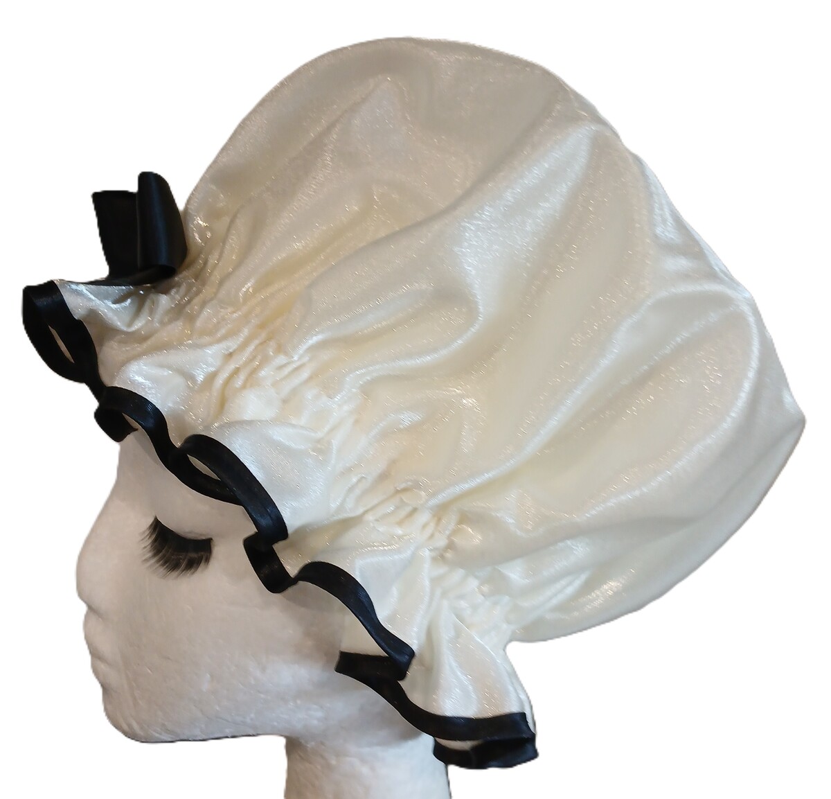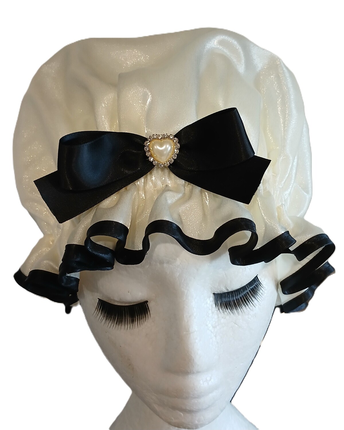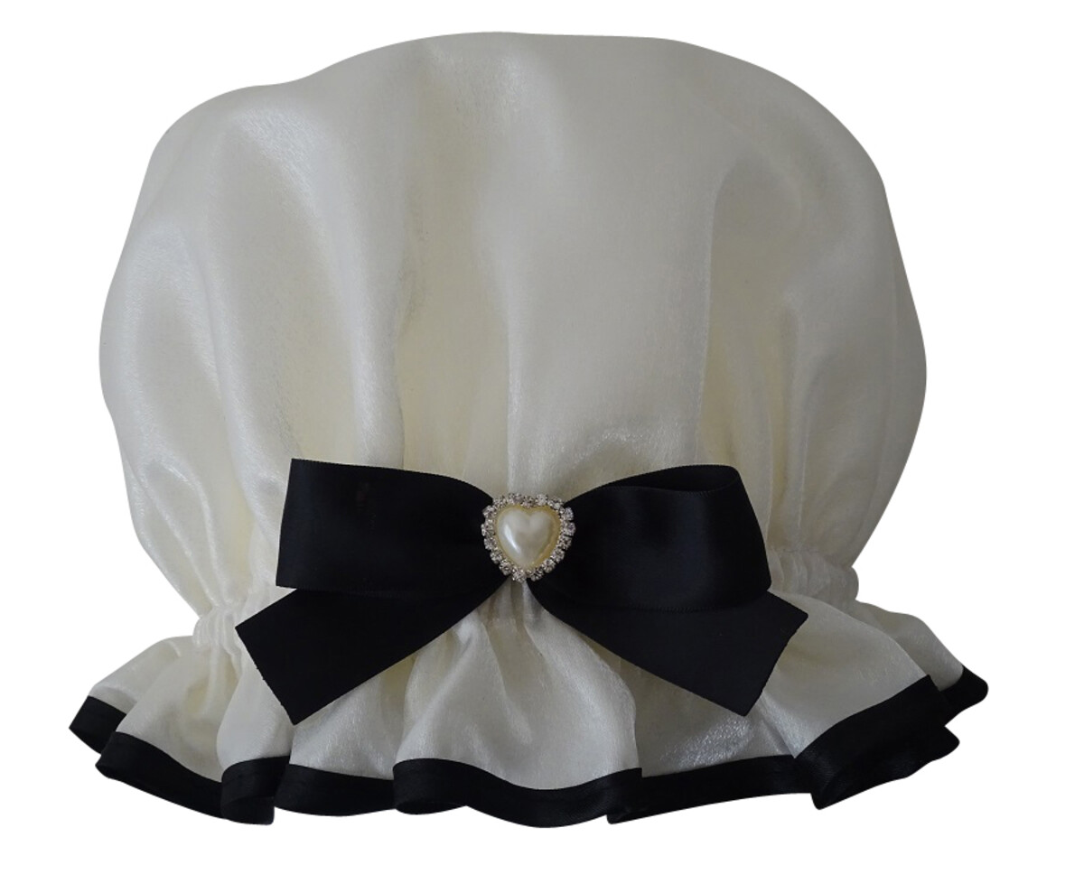 This shower cap is simply gorgeous and so feminine! A shimmery Satin Organza fabric in an Ivory colour embellished with a faux pearl and diamante heart. The So Pretty Charisma shower cap is generous in sizing and comfortably takes in a lot of hair. Stops the frizz happening too, or if you straighten your hair, does protect it. The colour of this fabric is neutral which makes it suitable for most bathroom decors as far as matching with other accessories such as towels for example. Fabrics like the one used in Charisma (as well as the Black Diamond, Chardonnay and StellaLuna designs) are ideal for shower caps as they dry very quickly and are very lightweight. This is an ideal situation for shower caps, particularly if you are travelling or even sharing the shower cap! Packing a wet shower cap in your suitcase isn’t the ideal scenario. They look lovely hanging around during the drying process as well, which is an additional bonus! Even as a shower cap for guests staying over, it would be a lovely hair accessory in the guest’s bathroom that will be sure to have them asking where the beautiful shower cap came from. Responding with the fact that they are handmade, and made in Australia is sure to impress whether you are in ‘Australia or anywhere else in the world. Handmade and made to last, So Pretty Shower Caps are renowned for their quality and longevity. So Pretty Shower Caps are found bathrooms all around the world and is proud of it!