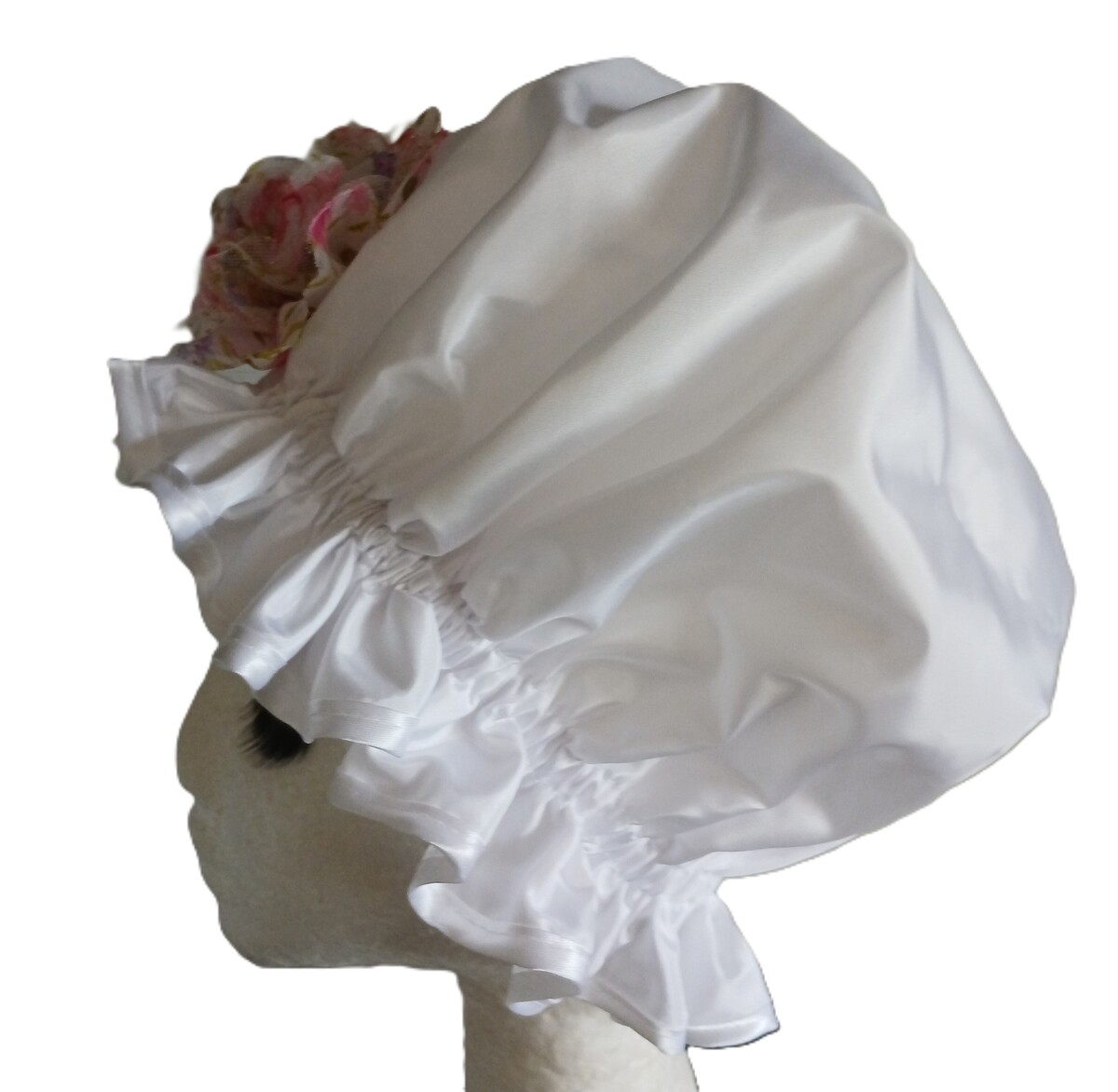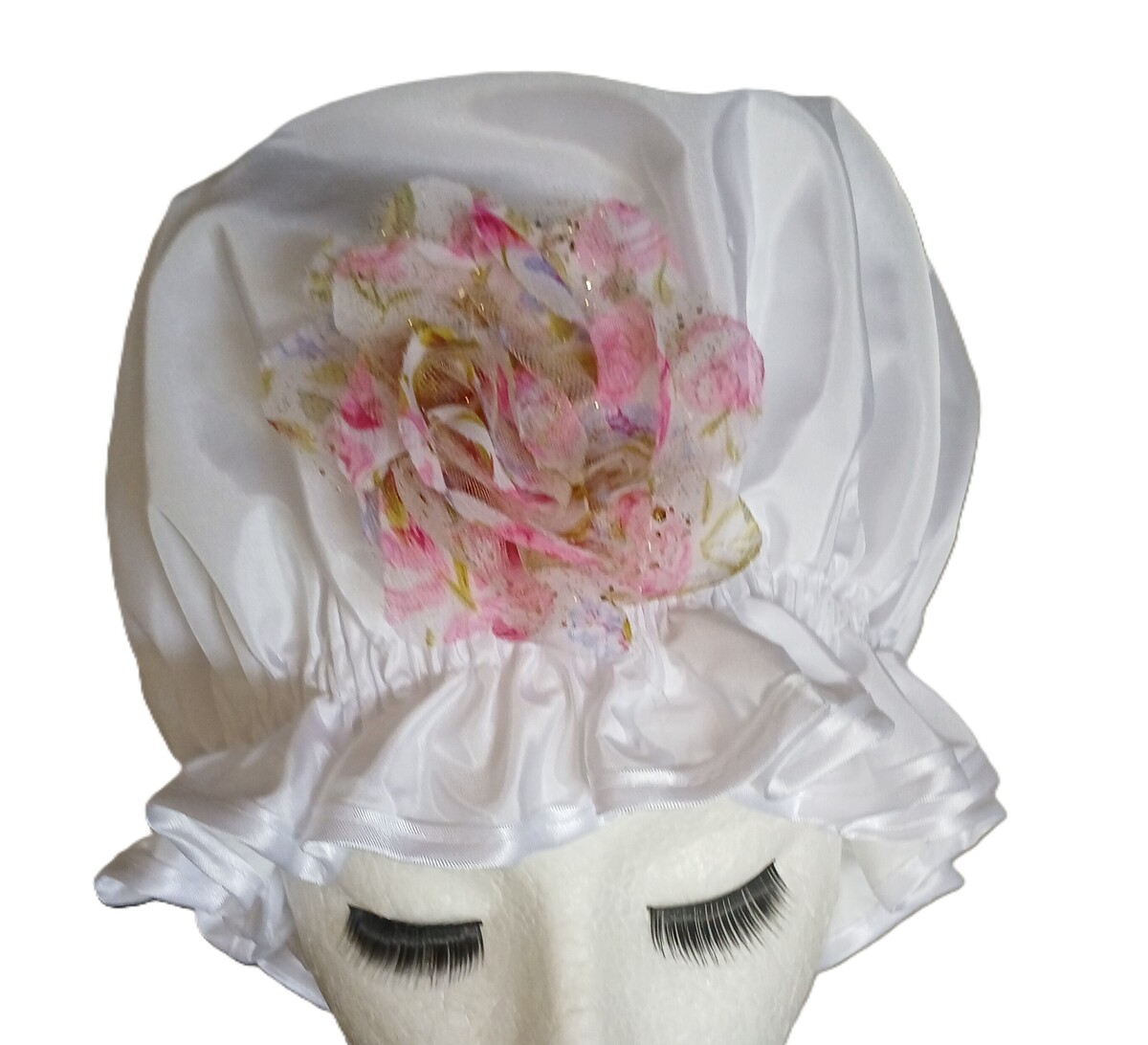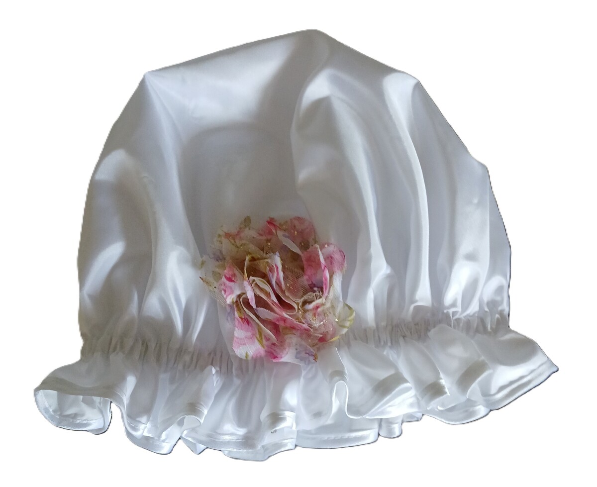 Sometimes a little less glamour in the form of a simple flower on a So Pretty shower cap is all you are looking for. So Pretty created the Flower range with this thought in mind. If you are not a ribbon and bows type of person, then perhaps these So Pretty Flower options are an appealing alternative! The So Pretty Classic White Flower is a clean and crisp Taffeta fabric which is ideal for quick drying and holds its shape perfectly. No more flopsy shower caps to deal with in your bathroom! White is an easy colour to match almost any bathroom, and is a safe option if this is a gift for someone special and you have no idea which So Pretty shower cap to choose! The flower embellishment on the Classic White is particularly pretty and delicately floral in shades of predominantly Pink with pale Green and a touch of Lilac throughout. The flower is hand made using Tulle combined with the floral fabric. A special effect is that the Flower has added sparkle which adds interest and a touch of bling to it. Isnt this the perfect way to add something floral and fresh looking to your bathroom? Under the lights of your bathroom, the subtle glitter on the flower will create a little piece of glamour to bathroom décor. Even when not in use this So Pretty shower cap will be a bathroom accessory you will be delighted to have on display!