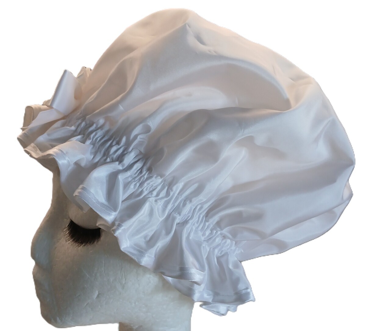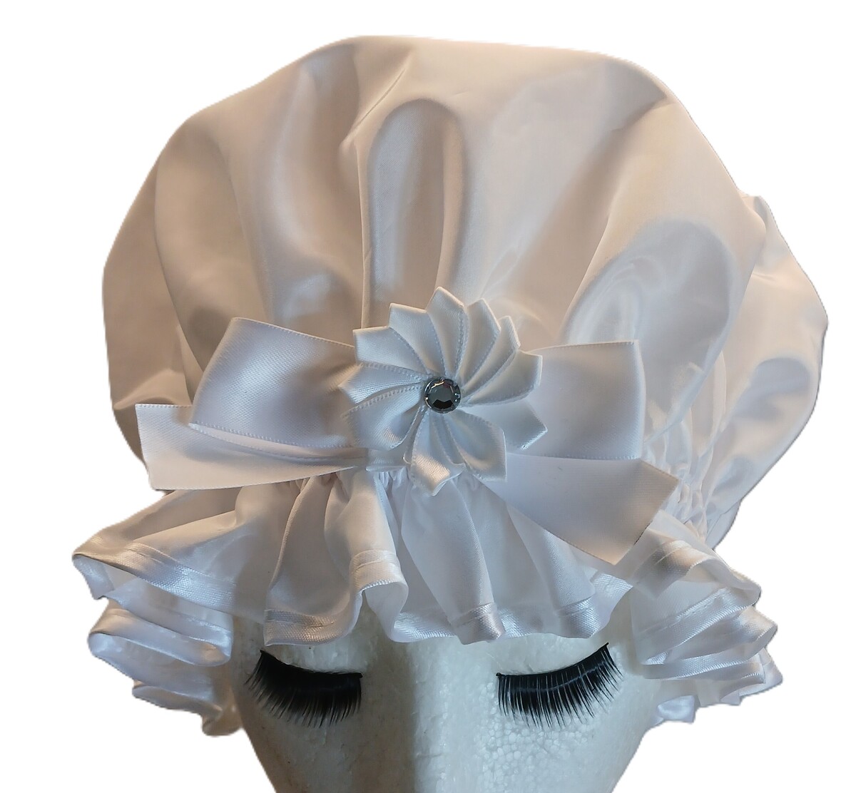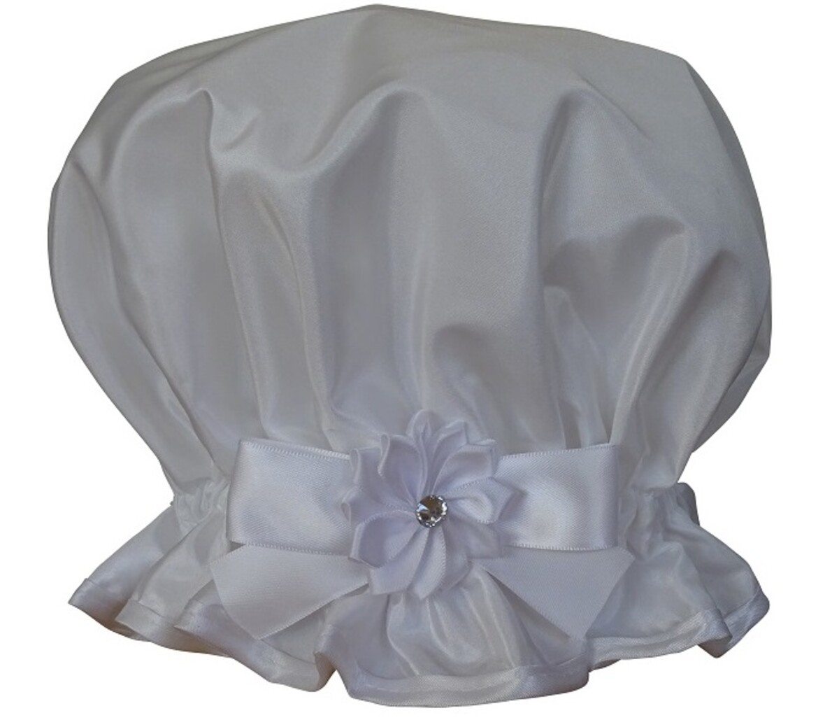 So Pretty Shower Caps Classic White - nothing can beat pure and simple white for a perfect shower cap like this one! This is the hair accessory of choice when you have absolutely NO idea which Shower Cap to select from the So Pretty range. This may be for several reasons, being unsure what someone you plan to gift this to will prefer or you don’t know their bathroom décor. It could very well be you are overwhelmed by the fabulous So Pretty Shower Caps range that it is the better option to go back to basics! White can never go wrong, it will match everything! This Classic White shower cap looks so classy in any respect, and is by no means a dull shower cap. A White crisp fabric is used but it is the larger than usual White flower trim with its glass bead centre that sets it off to the next level of glamour! It results in the Classic White shower cap being something special and proud to use and display in your bathroom. Of course the elephant in the room is that this shower cap is just perfect for a Bridal shower gift. So Pretty does have a Diamante Bride Shower Cap which is adorable, but if you know the Bridge is more conservative and would not appreciate the bling, then the Classic White is an excellent substitute! Embroidered White shower caps are also a great idea for corporate events, any form of team colours and ever Bridesmaids gifts. So Pretty Shower Caps is more than happy to assist with your creation ideas!