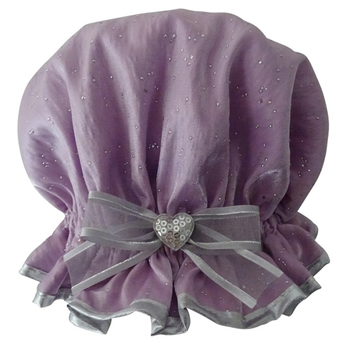 The Crystallina range of shower caps by So Pretty are so called because the glittery chips scattered over this fabric look like crystals. So this is a shower cap that sparkles, and what little girl wouldn't find that appealing! Finished off with an organza ribbon with Silver thread and a small Silver sequinned heart for added bling.