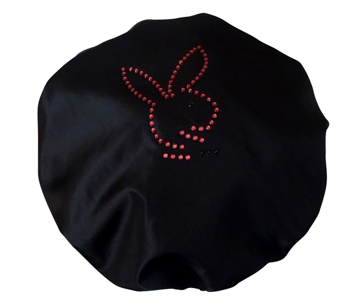 Here is a So Pretty Shower Cap if you feel like being a sexy Bunny Girl whilst keeping your locks dry! The classic symbol of the Bunny Girl in Diamantes on a Black shower cap is the epitome of cheekiness for the woman who owns it! This is a Black So Pretty Shower Cap with one small addition that makes a big difference in attitude! So Pretty Ladies Shower Caps are well sized to accommodate a lot of hair, are hand made and made to last using quality fabrics and materials. This Diamante Bunny Girl shower cap will look rather cute in your bathroom, and be an amusing point of interest or conversation piece should visitors (or your mother!) see it! (eg "Are you not telling me something?). Apart from anything, they may think it is a very expensive hair accessory, and exclusive as well since it has Diamantes decorating it. If not the sexy representation of this shower caps’ design, you may simply love Rabbits and why not? They are adorably cute and enjoyable to cuddle. Rabbits supposedly represent prosperity, abundance, good luck and fertility. Well we all know the reputation Rabbits have for fertility! The other aspects quoted are all positive and create well being. Similarly just as a So Pretty Bunny Girl shower cap would add a touch of glamour to your life too! So with all this in mind, perhaps a So Pretty Diamante Bunny Girl shower cap could be owned by a sexy lady who adores Rabbits! Whether this is you or you are looking for a gift for someone who suits all of part of this criteria, this shower cap just may tick all the right boxes!