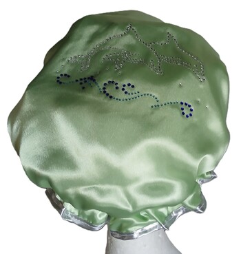 The So Pretty diamante Dolphin design is also available in the adult Ladies size, also in the pastel Lime. Hence an excuse to double up and Mum can match her daughters glamour shower cap too! A Mother/Daughter set can be purchased at a special price in the relevant section on this website. The Dolphin shower cap may be a gift as a hint for something you plan to do whilst on holidays…that is swim with the dolphins. Taking your own shower cap with you when you travel is a great idea in any case. Far outweighs putting up with those hotel giveaway packets that contain a flimsy excuse for a shower cap in their toiletry freebies! You are supposed to put that on your head?!