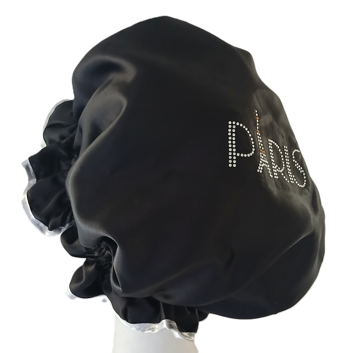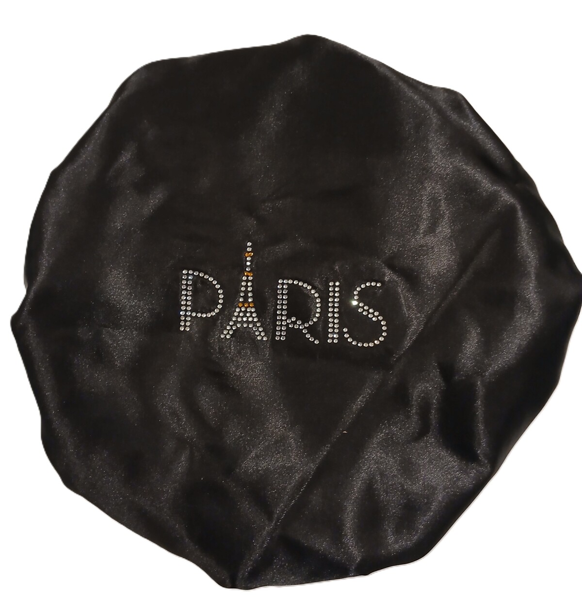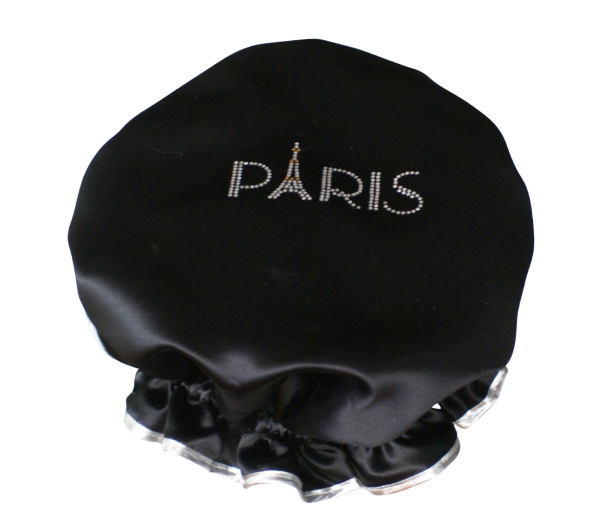 Oui madame, this is a French shower cap that is tres jolie! Paris, the city of love and fine food (not necessarily in that order, although a romantic date in a French Restaurant would be very much enjoyed). People often say they fall in love with Paris, the home of Monet, croissants and escargots. Oh and don’t forget the frogs legs, do they still eat those? Im sure there would be a Maccas there though, cannot escape them on our Earth! What about fine fashion and those wonderful skin care ranges that are French and very exclusive? Well I can offer the fine fashion with my diamonte Paris shower cap, I have done my bit. So for those who have been to Paris and love the idea of having a small reminder of those days by hanging my humble shower cap in their bathroom, this design is perfect for you! For those of us (like me) who haven’t quite got there (yet), then use this shower cap as a hint to anyone that will listen (and afford to take you), saying you would like to actually use it in France at some stage…in the meantime keep practising that French we learned in high school… so you can at least say to that person Je’taime under the Eiffel Tower!