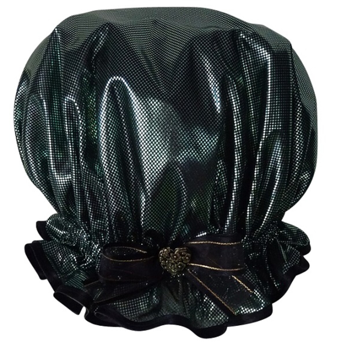 The So Pretty Emerald shower cap is another variety of the Foile Jersey fabric transformed into a classy hair accessory! It is a dark and elegant green associated with the Emerald stone and its reputation for elegance and luxury. Certainly you have this in abundance with a So Pretty Shower Cap! Foile Jersey is almost the most perfect material for a shower cap, and was one of my original fabrics of choice when So Pretty Shower Caps first began in 2002. This perfection is because it is pretty much waterproof on its own, and repels water with its glossy finish! The fabric is a standard go to for the dance costume industry because it has a wet look which makes it shine under the lights. A good look for the bathroom and a shower cap too! This Emerald fabric caught my eye as something a little different, it is a deep and rich colour of Green. The So Pretty Emerald shower cap has an underlying chequered pattern of Black amongst the colour so this makes it unique from the other Foile Jersey shower caps here on So Pretty. Trimmed with a gold edged Organza ribbon and a metallic heart which will not corrode. As for the colour Green, there are many options for a variety of shades of Green shower caps here at So Pretty! If this isnt quite your style, a colour search may lead you to the Green shower cap that is exactly what you are after for you, and your bathroom!