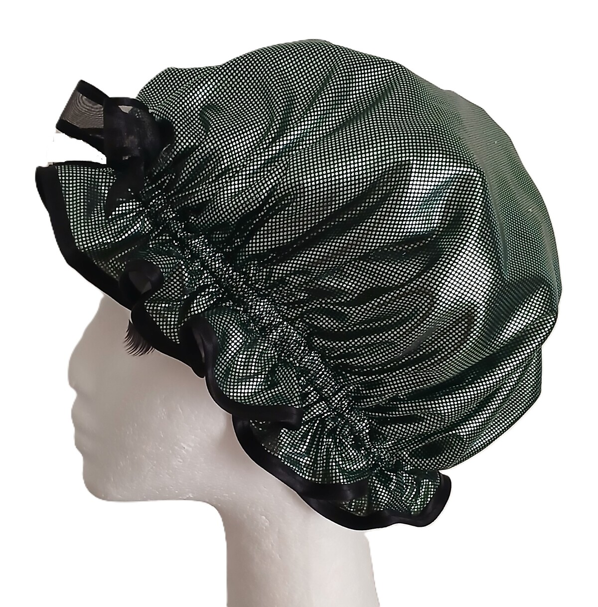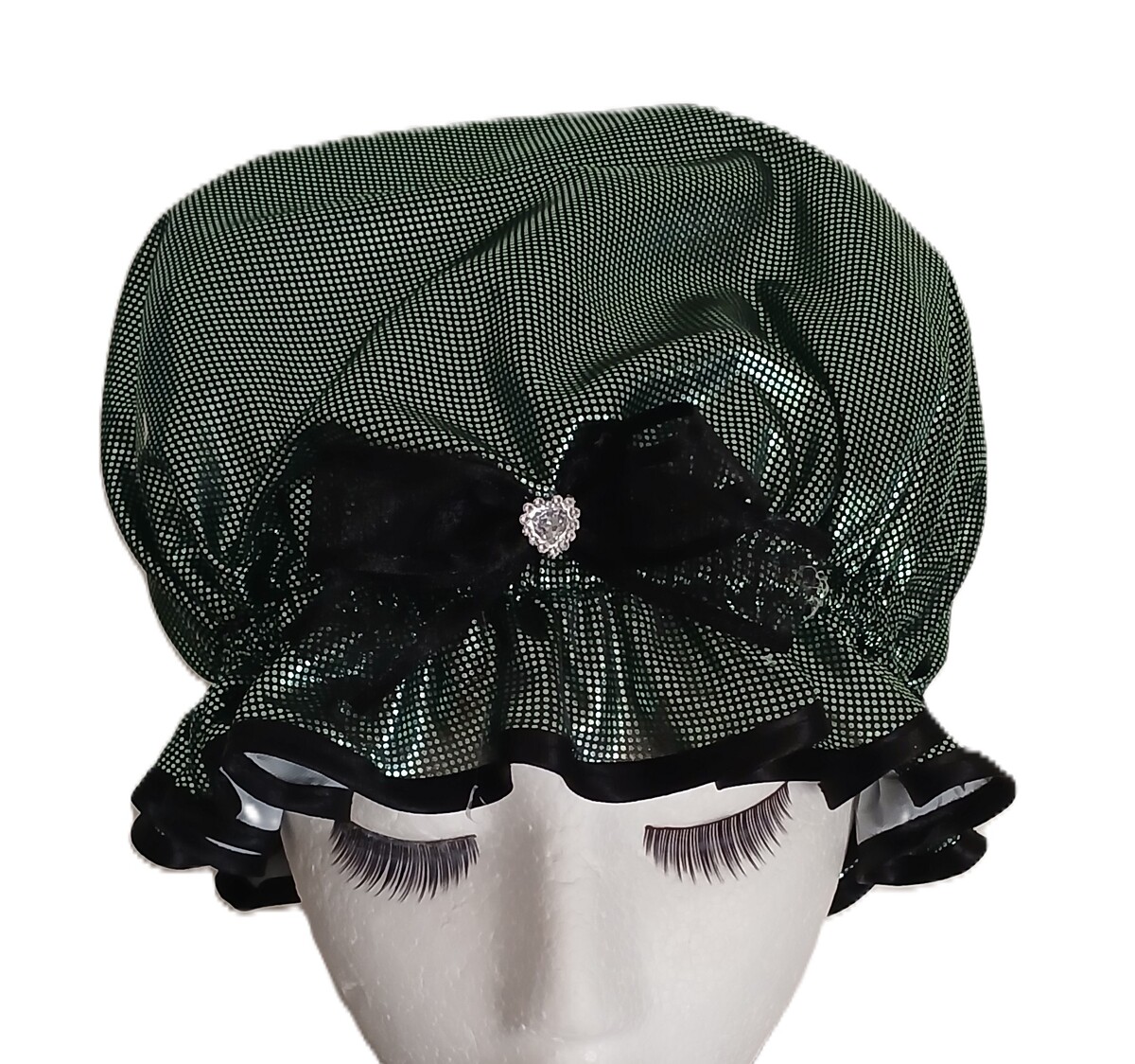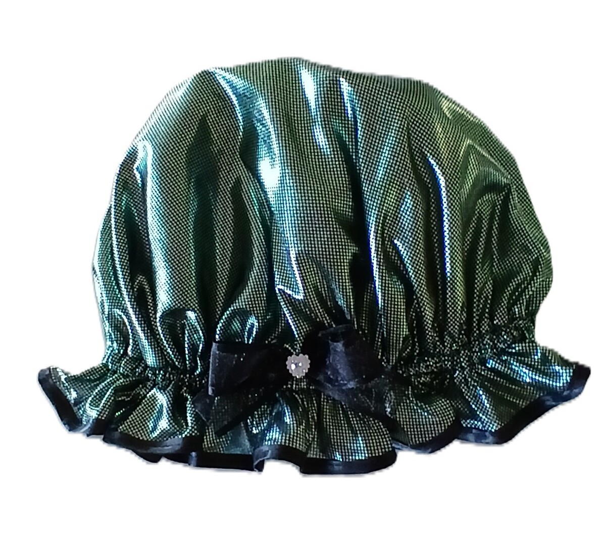 The So Pretty Emerald shower cap is another variety of the Foil Jersey fabric transformed into a classy hair accessory! It is a dark and elegant green associated with the Emerald stone and its reputation for elegance and luxury. Certainly you have this in abundance with a So Pretty Shower Cap! Foil Jersey is almost the most perfect material for a shower cap, and was one of my original fabrics of choice when So Pretty Shower Caps first began in 2002. This perfection is because it is pretty much waterproof on its own, and repels water with its glossy finish! The fabric is a standard go to for the dance costume industry because it has a wet look which makes it shine under the lights. A good look for the bathroom and a shower cap too! This Emerald fabric caught my eye as something a little different, it is a deep and rich colour of Green. The So Pretty Emerald shower cap has an underlying chequered pattern of Black amongst the colour so this makes it unique from the other Foile Jersey shower caps here on So Pretty. Trimmed with a gold edged Organza ribbon and a metallic heart which will not corrode. As for the colour Green, there are many options for a variety of shades of Green shower caps here at So Pretty! If this isnt quite your style, a colour search may lead you to the Green shower cap that is exactly what you are after for you, and your bathroom!