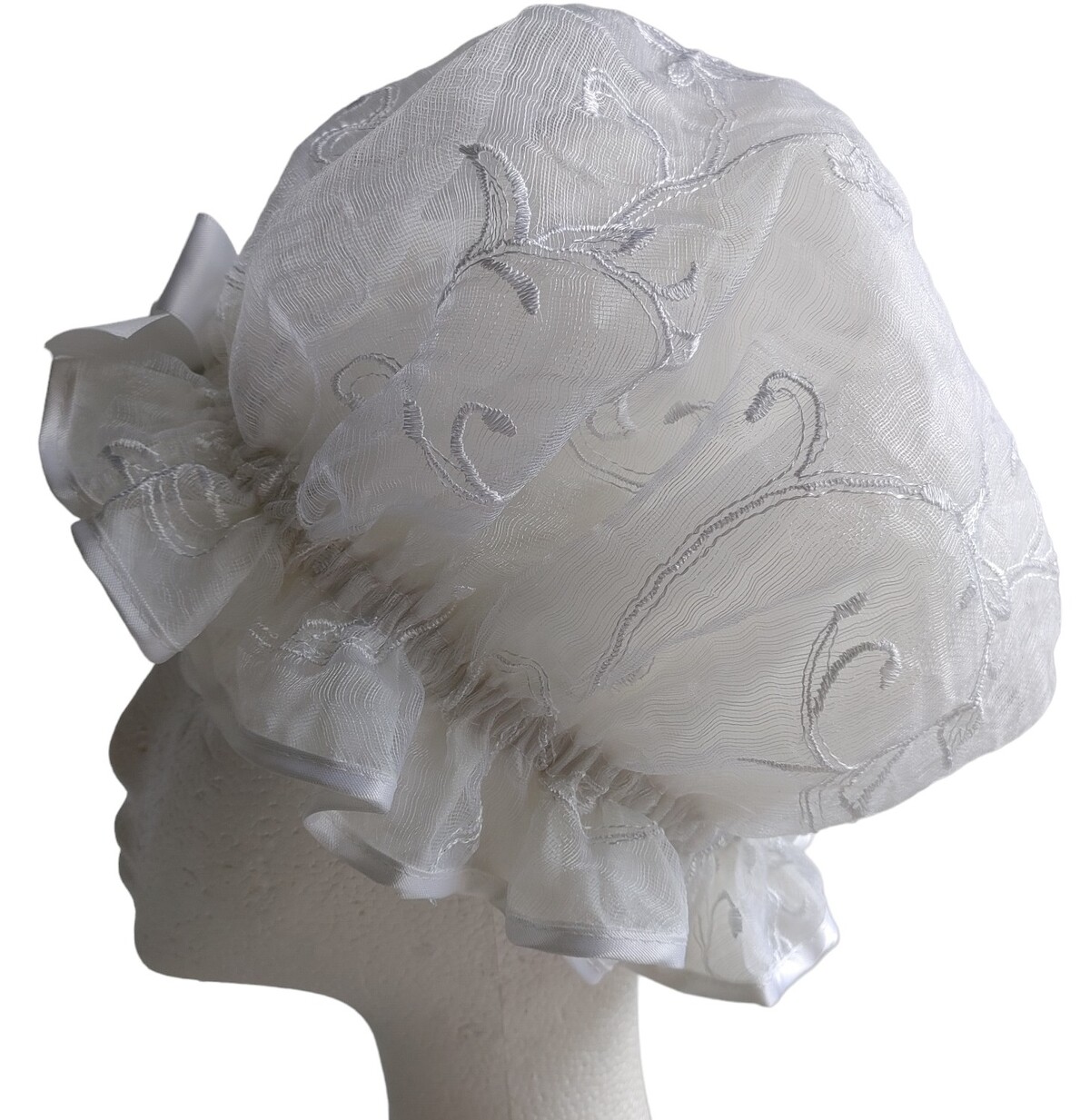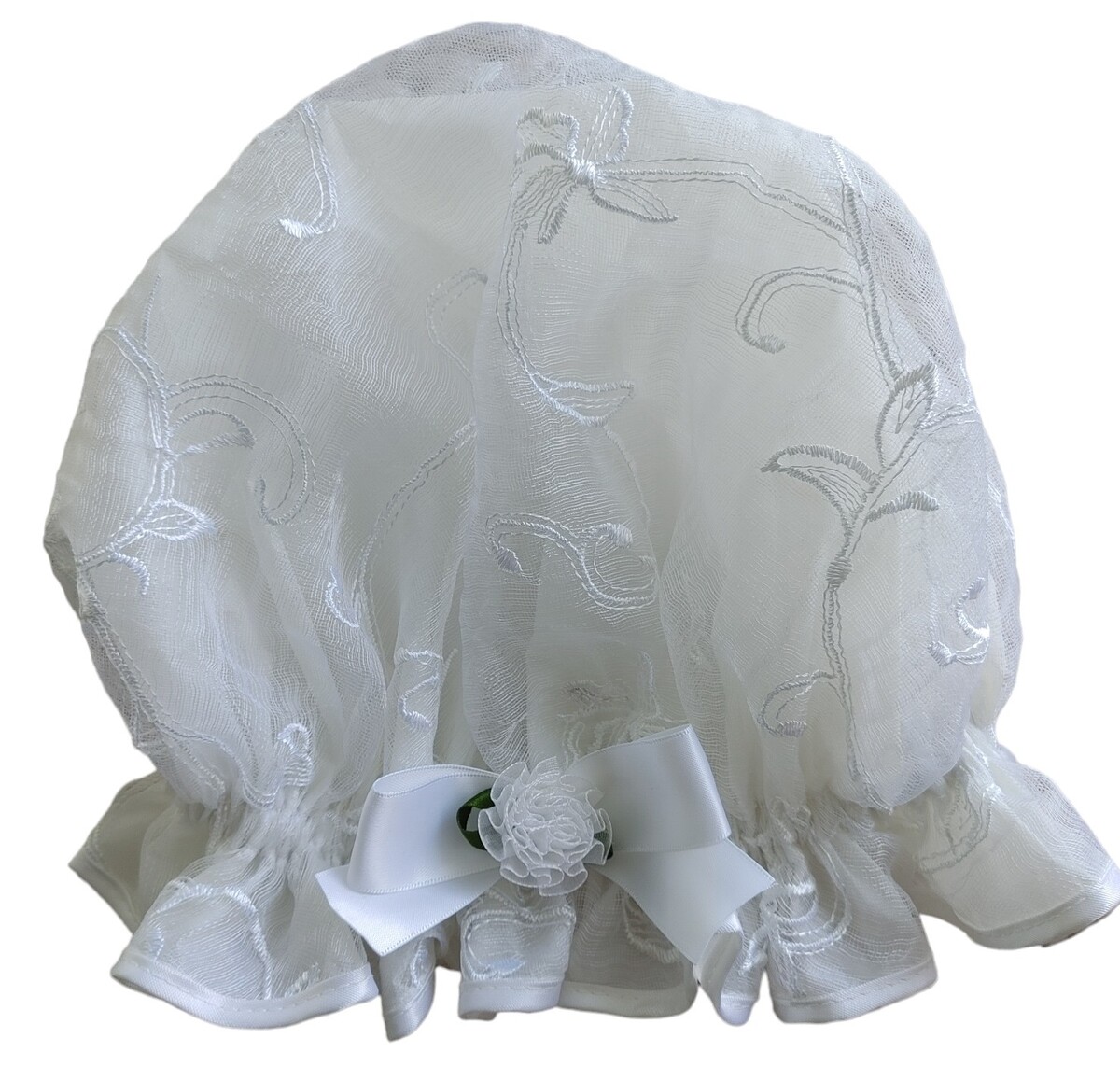 Frosted White by So Pretty Shower Caps is another white themed design, this time a sheer White embroidered style of lace fabric overlaying the inner plastic lining. Touched off with white Satin edging and a sheer White Organza carnation flower. The Frosted White shower cap certainly exudes Vintage Style as a hair accessory. The frilled edge gives it an old fashioned look, even Victorian in this instance, but in fact is quite practical in keeping your hair dry at shower time! This being a lace style fabric makes it very quick drying, something that So Pretty takes into consideration when selecting suitable fabrics for its shower cap creations! Here is another suitable alternative for a Bridal gift! Especially if she is going for a more Vintage or lacey look for her wedding dress. This shower cap would compliment her style without a doubt and as a gift is sure to be appreciated! After most likely spending so much time and money preparing her hair for the Wedding Day, any So Pretty Shower Cap will keep it looking nicer for a little longer if she so wishes. A white shower cap like this Frosted White may also be loved by older ladies who are in the generation of those where lace and doilies were always part of the home décor. A Frosted White shower cap will most likely be loved and become a favourite "special" item in their bathroom. Be warned some ladies think So Pretty Shower Caps are too nice to be used, it may take some convincing to get them wet!