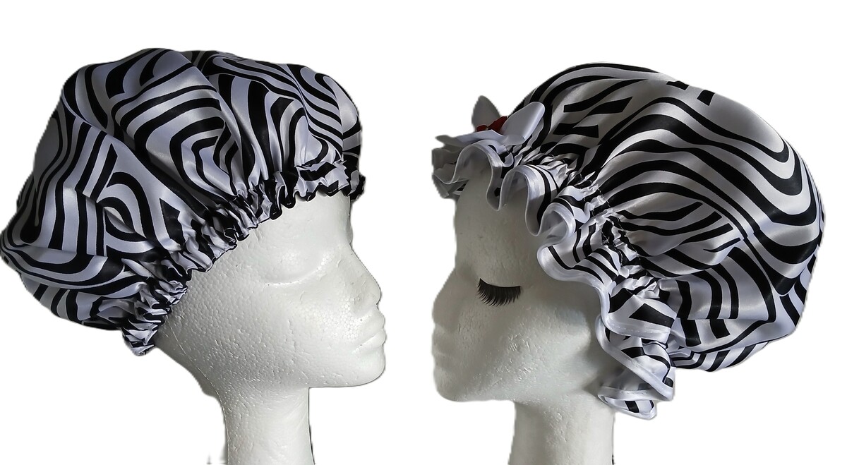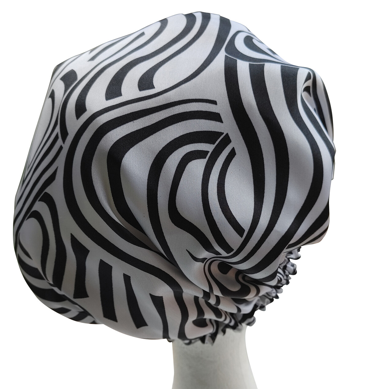 A HisnHers set of So Pretty Shower caps in a modern Black and White print named Dynasty for no particular reason! Here the So Pretty Ladies shower cap has a bit of bling in the form of a Red Ribbon Diamante flower. Men can be a challenge to convince using a shower cap but So Pretty has made this all the more acceptable with a simple but practical design so they will be happy to do so! The So Pretty Mens shower cap has a wider band of elastic that creates a firm yet comfortable fit. The elastic used is high quality so this So Pretty Shower cap is made to last!