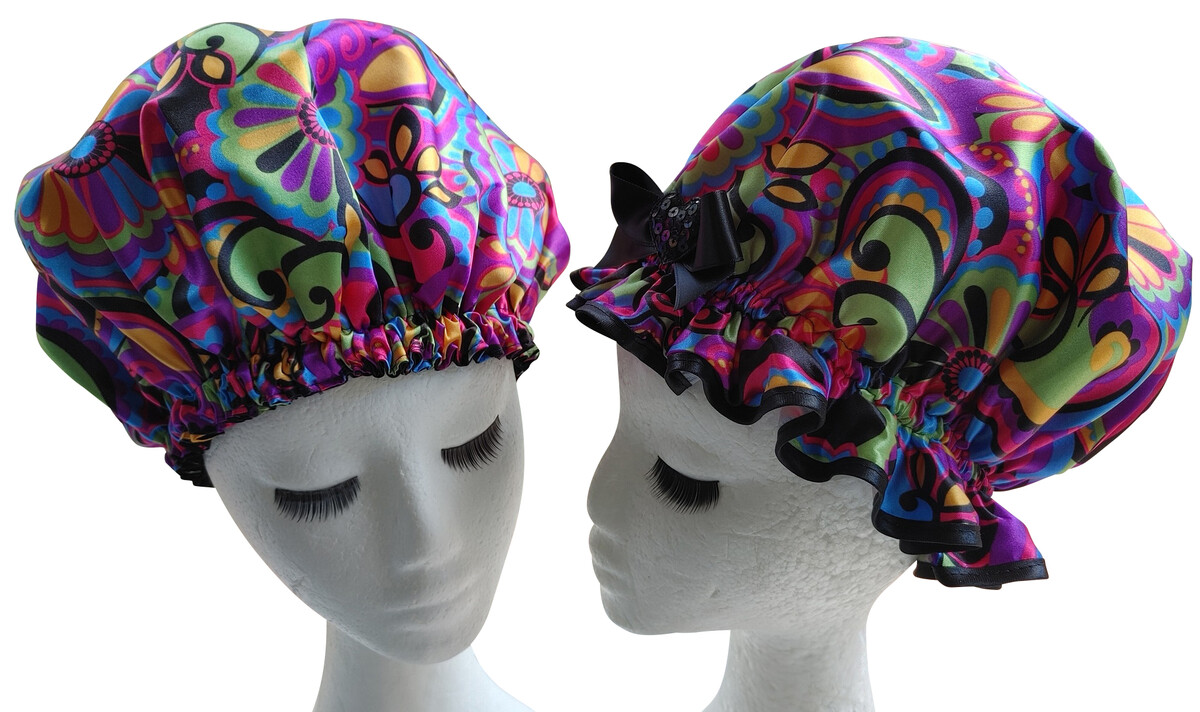 The Razzamatazz is one of the newer designs here on So Pretty Shower Caps. It is bright, fun and definitely would suit personalities that would fit the same description! Hence in this category of His ‘n’ Hers I am thinking the set of Razzamatazz shower caps would be ideal for a fun loving couple, perhaps young or young at heart. As mentioned in the individual shower cap descriptions, the pattern of Razzamatazz is a funky 70’s look, from back in the time when Flower Power was all the rage! Long hair on Men was the norm too and it is quite a cycle of fashion trend to see that happening all over again nowadays.