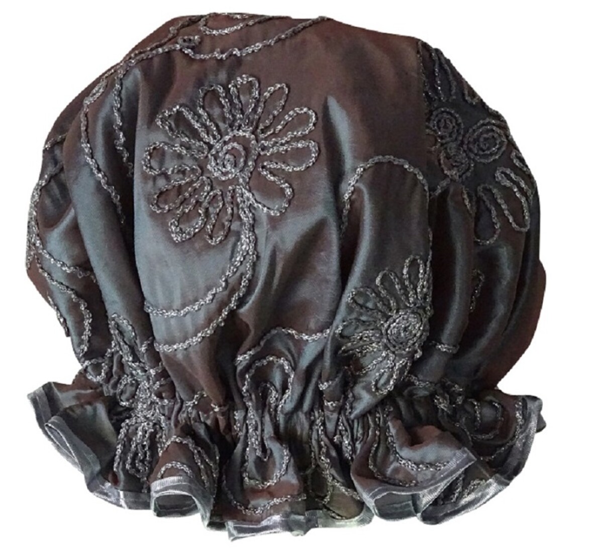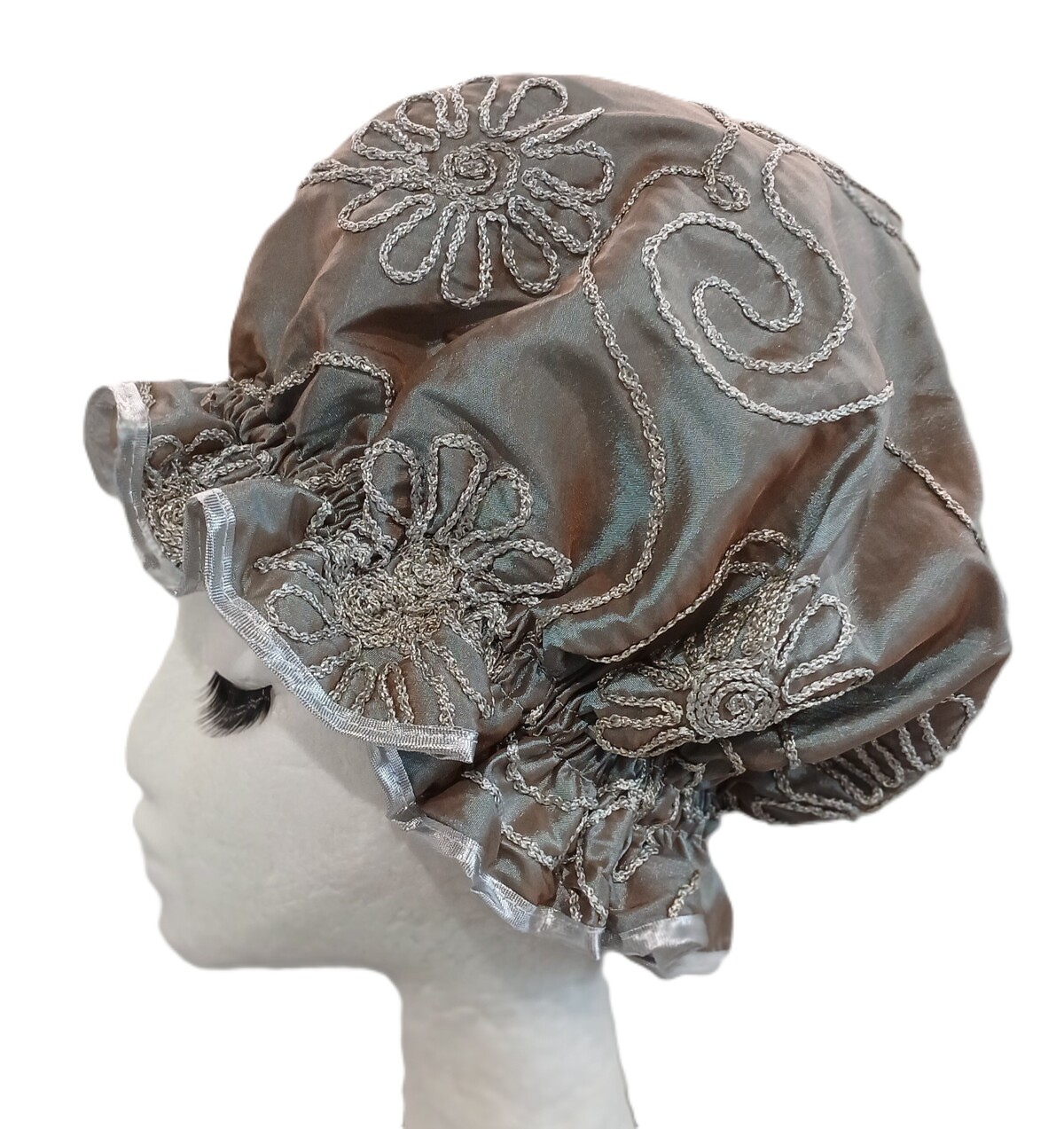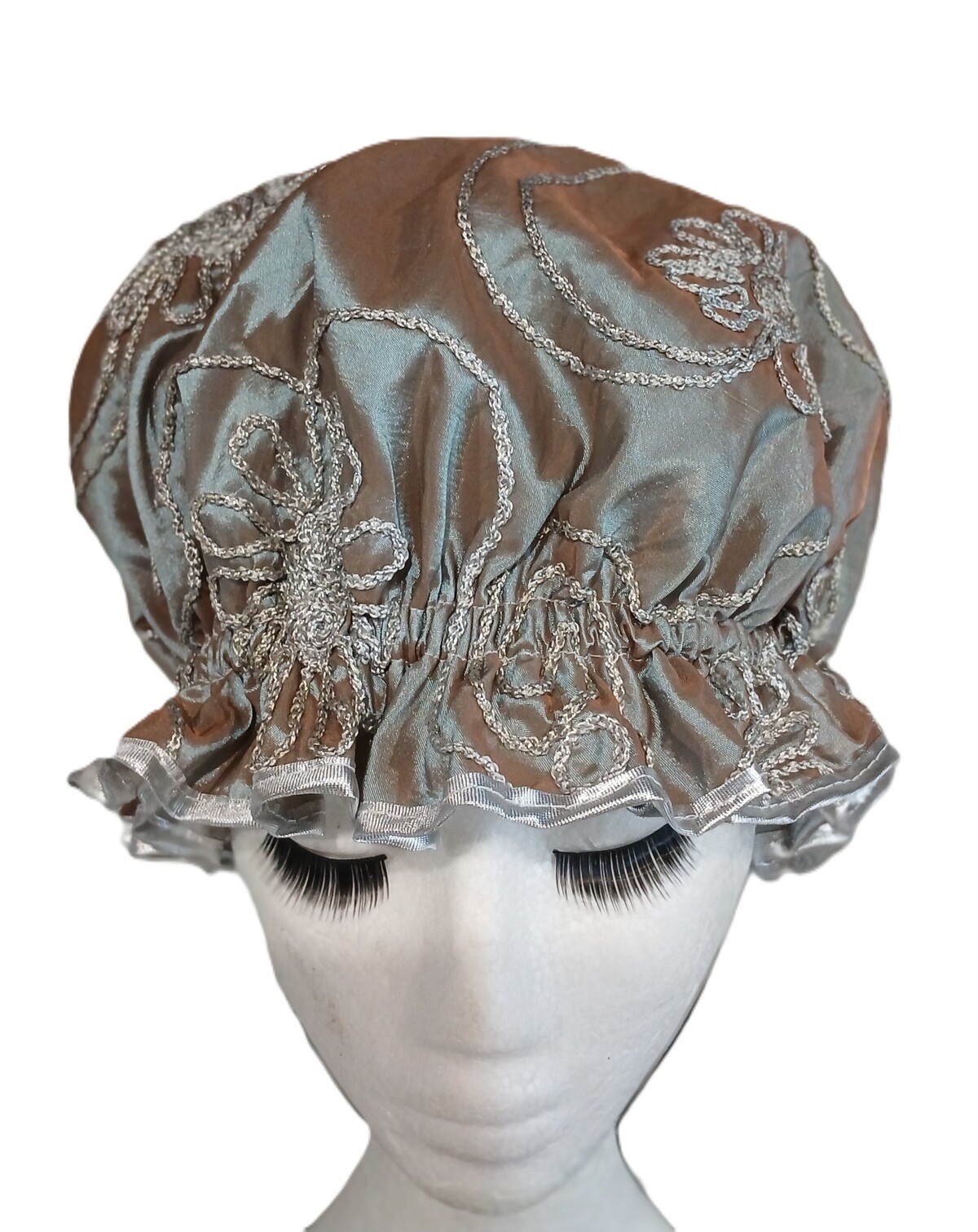Time for a cuppa and a relaxing bath anyone? The Lady Grey Shower Cap is named after a variety of tea I do realise, but can also be taken in the context that you will feel quite the glamourous Lady whilst using this So Pretty Shower Cap! A double innuendo if you please! Most likely if you are soaking in a spa or bath, a nice glass of wine or champagne is in order in reality! Perhaps that cuppa can be reserved for when you use a So Pretty Shower Cap to keep the hair off your face whilst applying a face mask. There are alternative used for a shower cap if you think outside the box! The Lady Grey is such a high end fabric I am so proud to have this in my collection. The design is so unique with its raised embroidered thread of swirls and flowers I felt it did not need any further embellishment. It is a stand out shower cap as it presents and hence perfection! The floral pattern has a glittery silver thread through it which makes this fabric even more special. There is a Green (Tea) variation of this shower cap as well which is equally as gorgeous. The quirky thing is, is that these two fabrics were found in totally different sides of the world! This fabric also has a lovely shimmer to it, this has been hard to show in the image perfectly but trust me, it does! There are several silver themed shower caps here at So Pretty that are a good match for the bathroom if you are looking to co-ordinate the decor. Silver is a great colour that goes in harmony with most bathrooms, particularly if they have silver tapware and fixtures. Lady Grey could just be that perfect match!
