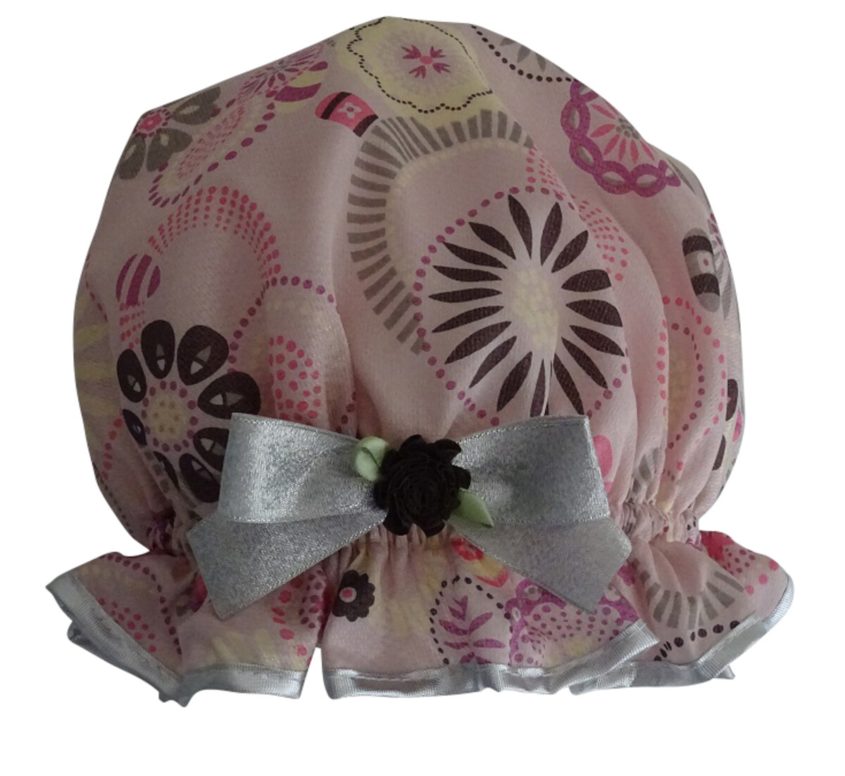 The So Pretty Melody Ladies shower cap is a very lightweight and subtly textured fabric which makes it especially perfect for fast drying after use. There are two colours available in this design, Pink and Sage. Both are trimmed with a Silver bow and Dark Brown Carnation flower.