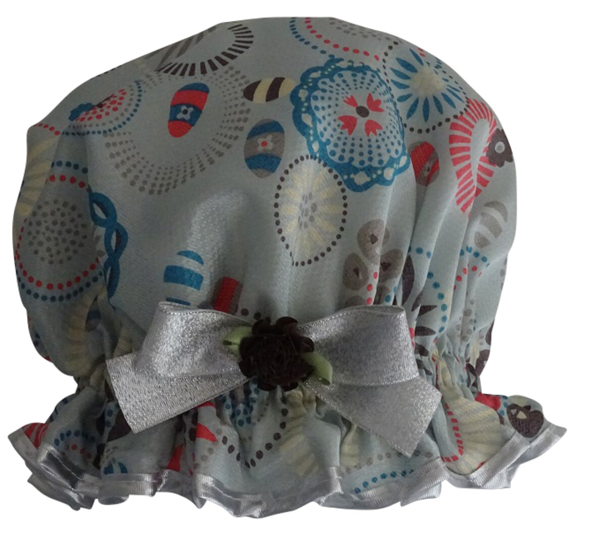 The Melody shower caps by So Pretty are a light hearted and fun design for a shower cap, the fabric is light and a little different to the norm too! Available in a subtle Sage or Dusty Pink option. Both So Pretty designs are similarly trimmed with silver Lame edging, matching silver Lame ribbon bow and a chocolate Brown carnation ribbon flower. The pattern on this So Pretty Shower Cap is almost like a doodle collection of abstract flowers come to think of it. Now doodles are supposed to have some form of deep and thoughtful meaning, so whoever designed this fabric must have been happy at the time I think! How many times have you been on the phone and doodled away whilst biding time during a call centre queue? Perfect time for doodling isn’t it! Depending on who and why you are calling can make all the difference to what artistic talent appears as a result….be it angry zig zags, swirly patterns or even flowers! Maybe the person who designed this fabric was on a long phone conversation with someone they love to have created such a delightful pattern. So why did I call this Melody? Probably because I related it to flowers, happiness and then singing when you are happy, and singing in the shower. Which meant singing a melody. (I stopped procrastinating on a suitable name for this So Pretty Shower Ca at Melody obviously!) All makes sense now doesn’t it! Ahh how great minds work, see I am not only just a talented creator of shower caps!