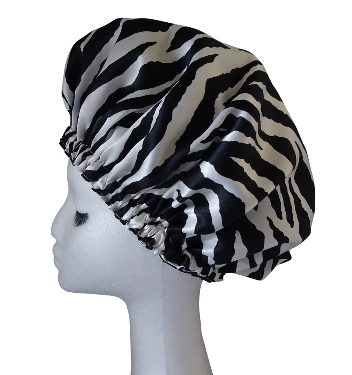 So here is the So Pretty Zebra Mens shower cap, a classic Satin Animal Print in Black and White Stripes. Simple colours and a Zebra pattern for a basic no frills shower cap but a quality hand made one!