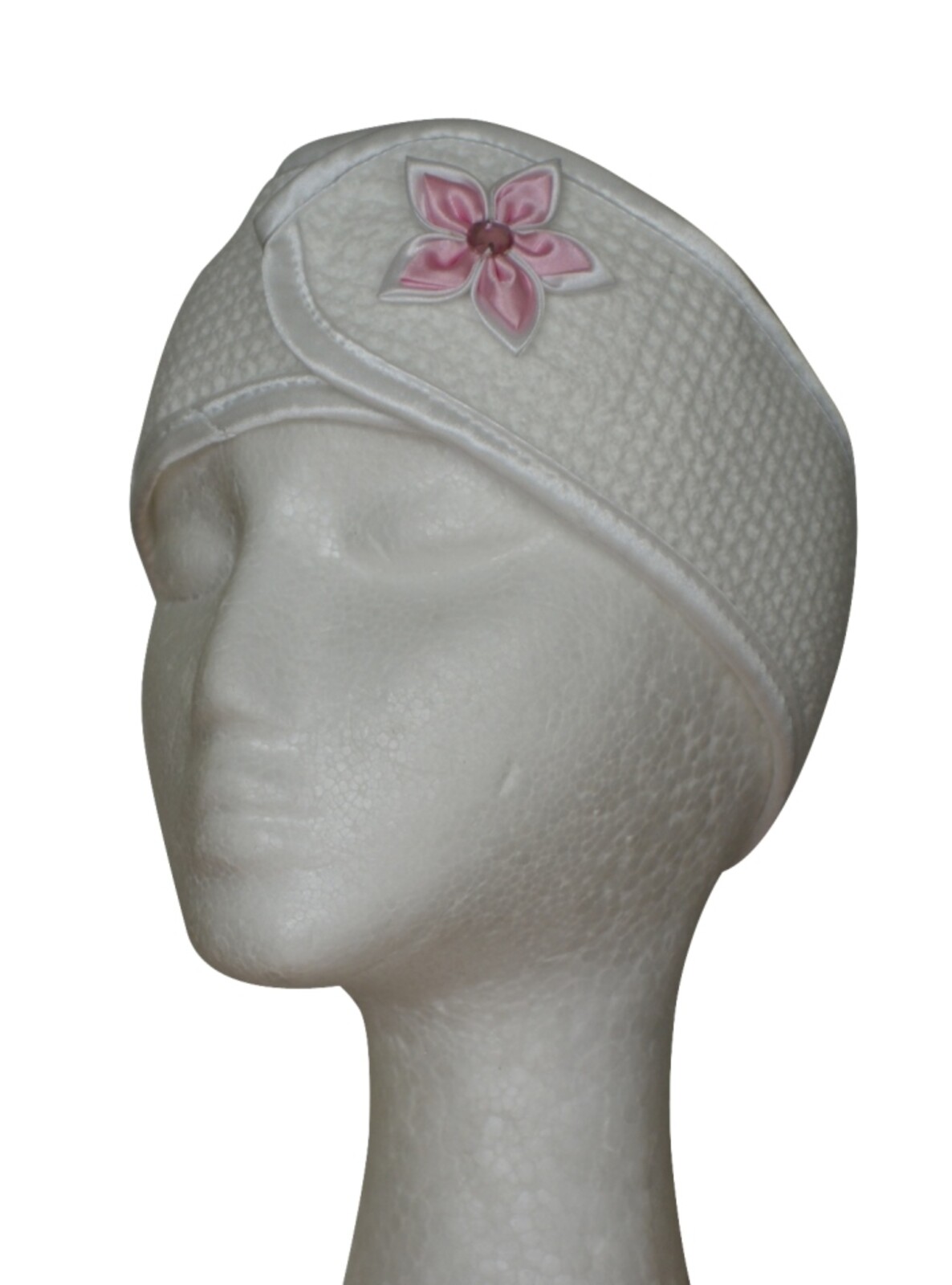 A quality Microfibre So Pretty Head Wrap that is not only practical but looks appealing as well!  This one features a large Pink and White Satin flower which is centred with a glass bead.