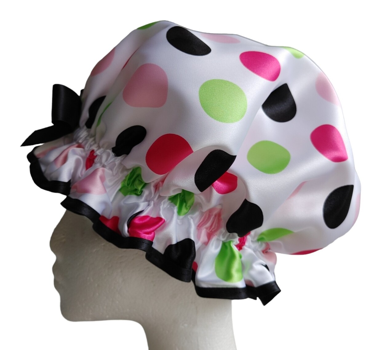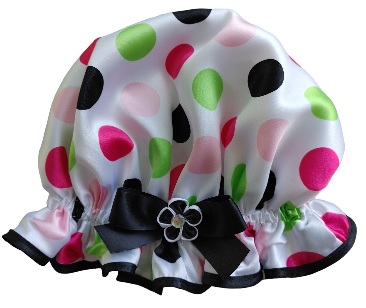 Usually a term of endearment for a young girl, but I thought it to be an appropriate name for this cute So Pretty Shower Cap. The print would  perhaps pass as a form of Polka dots of the larger kind even though these are larger than average and multicoloured. Still the So Pretty Missy Moo shower cap is a fun Polyester Satin print and has been transformed into a cute shower cap that would appeal to the young, or young at heart!