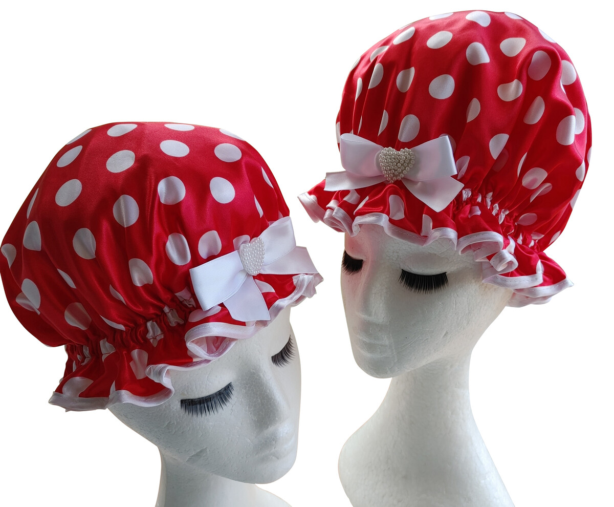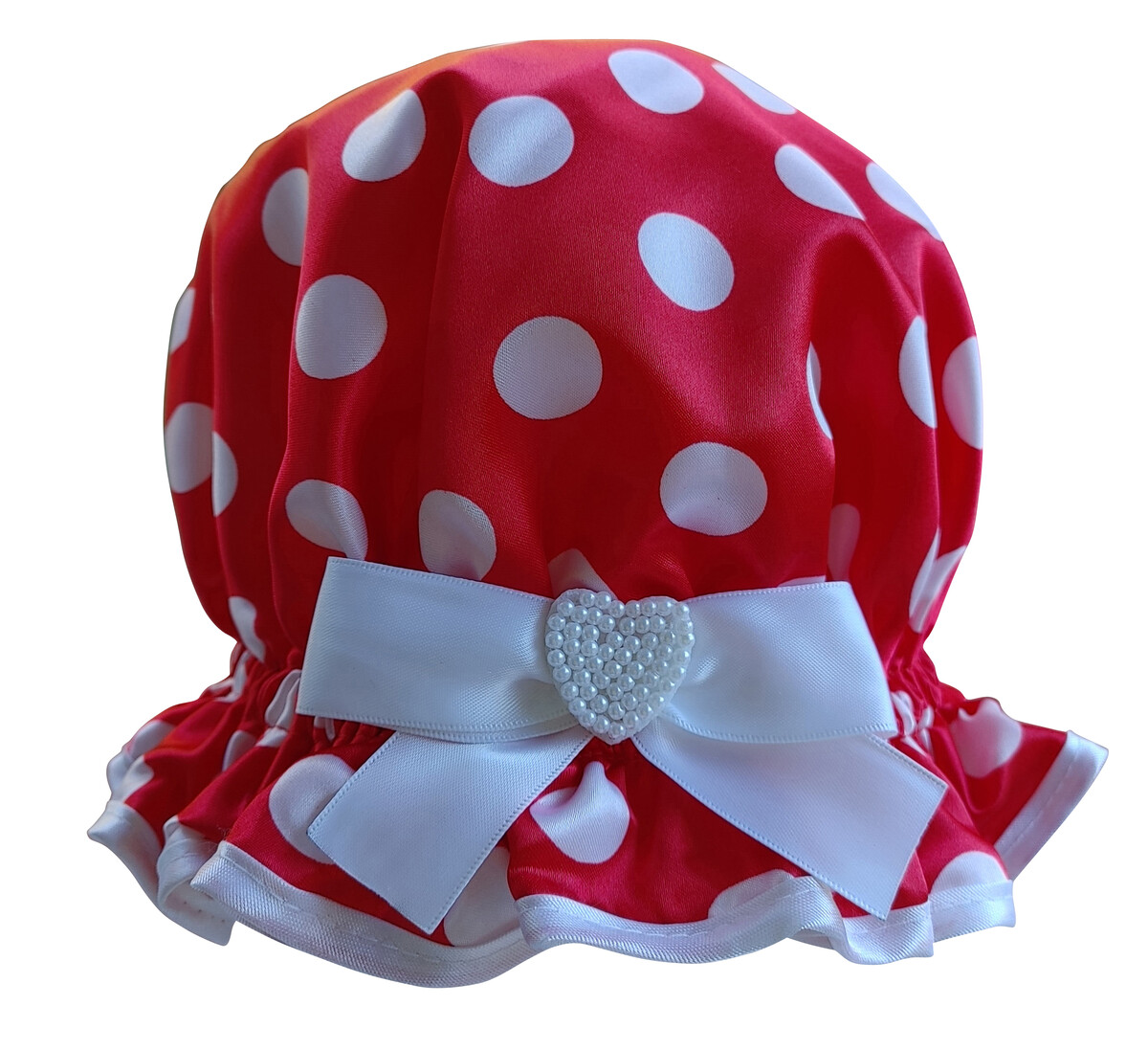 Red with White Polka dots is a classic print relating to Minnie Mouse, hence this So Pretty Shower Cap design is named Minnie. This is a Mother/Daughter set consisting of one Ladies sized Minnie shower cap, and one Girls size Minnie shower cap. The Girls size suits ages 3-9yrs and the Ladies every age beyond this! Both So Pretty Shower Caps accommodate a good volume of hair, in fact the So Pretty Girls shower cap can still fit an Adult, but just would be a snug fit if you are happy with this look. Otherwise both sizes are bouffant style for the appropriate ages they were designed for.