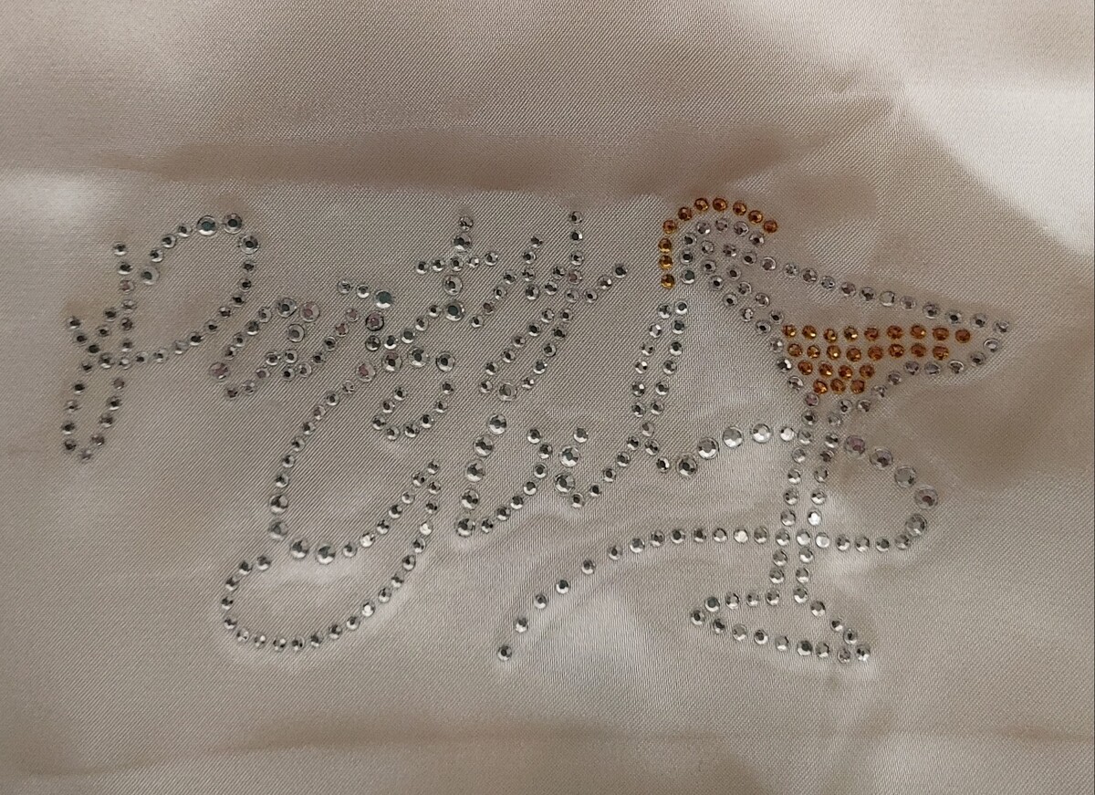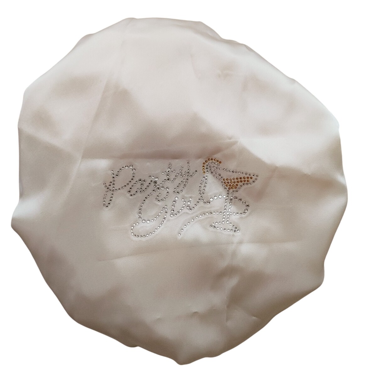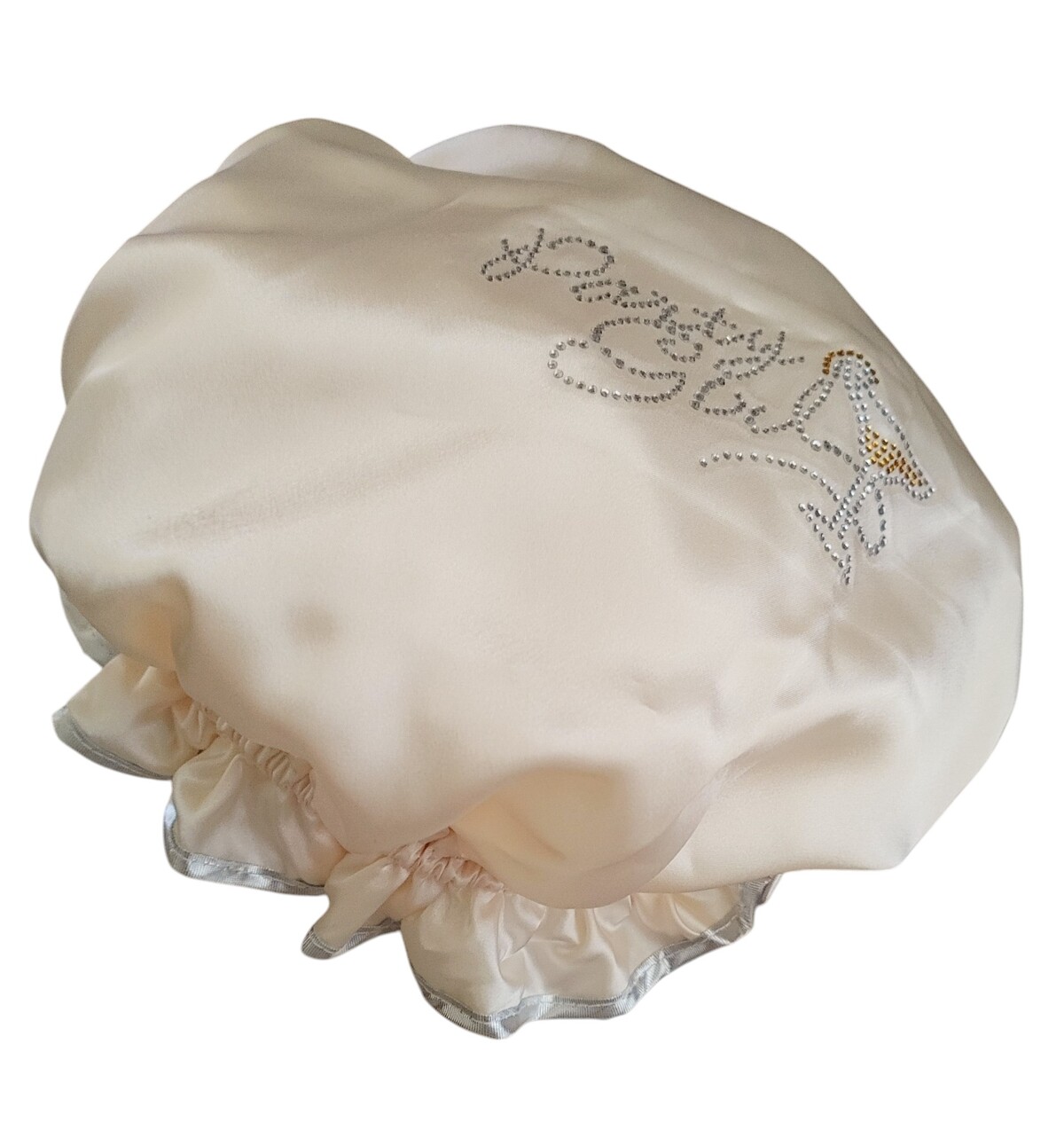 Diamante shower cap with the Party Girl design on Ivory Charmeuse Satin. An opportunity here to grab a beautiful and fun shower cap at a discounted price. On sale purely as it will no longer be offered in this colour.