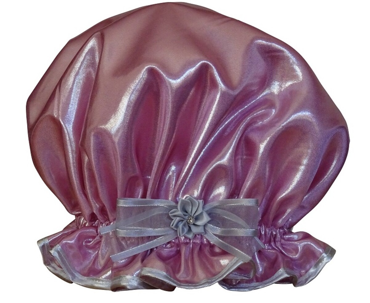 The So Pretty Pink FJ shower cap already looks like it is wet before you even use it, but this is an illusion! The Foile Jersey fabric has this fabulous wet look and was originally used for costume and dance apparel until So Pretty added another suitable purpose for this material! This shower cap is edged with Silver Lame trim, Silver Organza ribbon and a complimenting Silver Rhinestone satin flower. Overall an elegant and simplistic looking shower cap but would still add that touch of glamour to your bathroom even when not in use. Foile Jersy was one of the original So Pretty Shower Cap fabrics introduced to the range back in 2002 and is still popular now! Almost water proof on its own, Foile Jersey becomes a beautiful and quality shower cap that So Pretty has glowing reputation for. After producing shower caps for so long, So Pretty has turned around the reputation for dowdy shower caps forever. No longer are they thought of as a cheap and disposable product that you pick up as a freebie during a hotel stay. So Pretty shower caps has glamourised and revolutionised this hair accessory many years ago and has changed the attitude to owning a quality shower cap in the meantime. Many Ladies (and Men!) had the mentality that So Pretty Shower caps were expensive, and of course they do look this way if you are comparing to a throwaway piece of plastic, anything would be! So over time Ladies have come to realise that So Pretty Shower Caps are hair accessories of quality, hand made and hence made to last. So it doesn’t take very much to change your way of thinking when you compare something disposable against a handmade product that lasts and looks amazing does it!