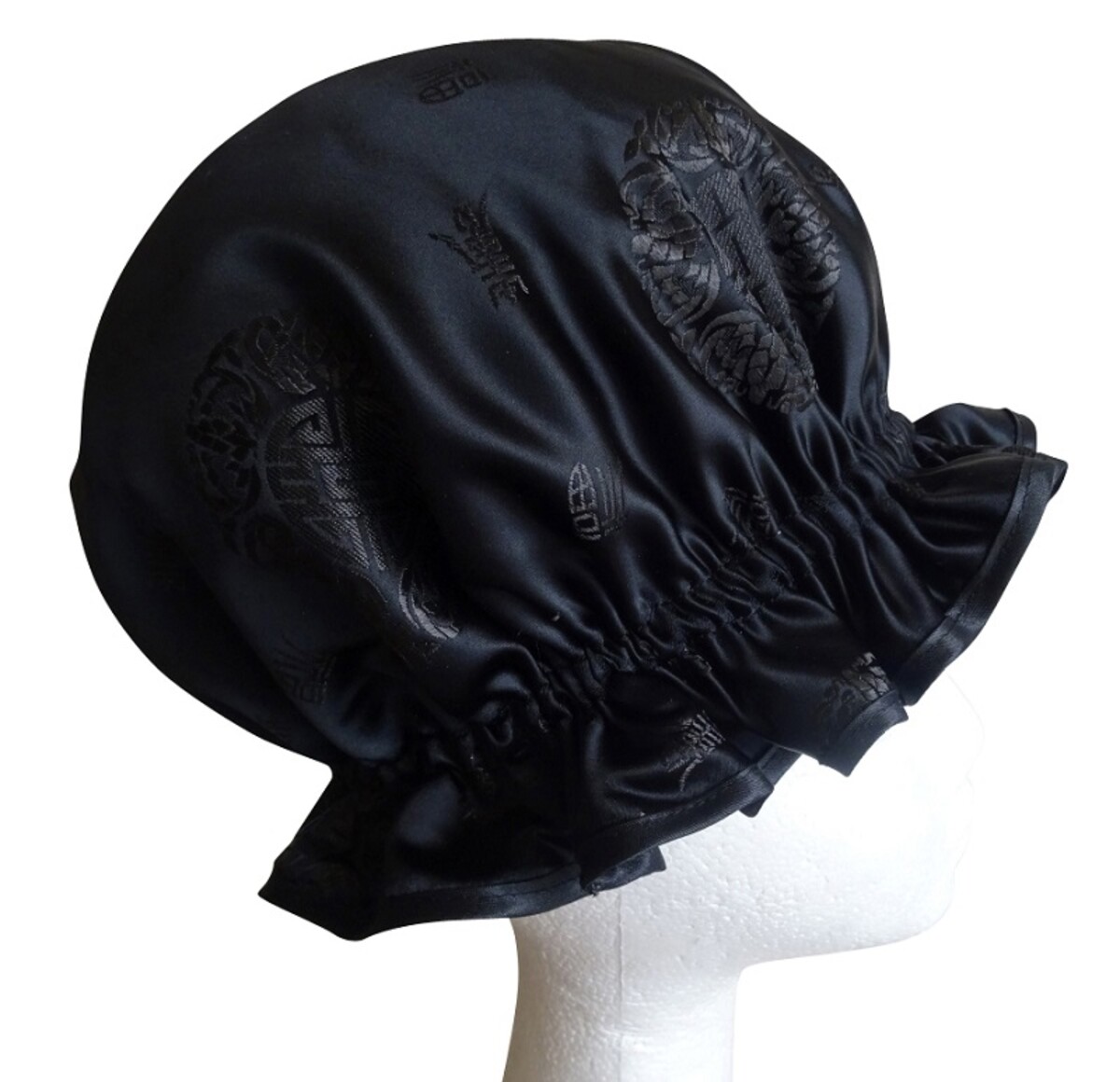 This So Pretty Sleep Cap or Sleep Bonnet is named Oriental Black. It is a slightly heavier Satin but not as heavy as Chinese Brocade, with an inner lining of a solve Silver Silver Satin. There is an oriental themed circular pattern embellished on the Black Satin, giving what would be a plain hair accessory some added interest and style! This So Pretty Sleep Cap would suit a lady looking for something plain but pretty, and look after your tresses in the process. The sizing of the So Pretty Sleep Cap is the same as a standard Ladies So Pretty Shower Cap. This makes it voluminous and will hold long hair down to mid back comfortably, so is a very generous allowance. Take a look at the"About My Shower Caps" page to see a hair length example. Using a So Pretty Sleep cap such as these is not the only option! Any circumstance where you need to keep your hair at bay or protect/cover your head makes this a practical and"so pretty" solution! Especially since it is elasticised so it wont be affected by windy weather! Examples could be in hospitals, food prep scenarios, disabled people outdoors in wheelchairs, pretty much anything where hair either needs to be kept out of a situation or protection from the sun! Sleep caps like these would also be a pick me up hair accessory for Ladies undergoing Chemo, or to protect their scalp when outside if exposed due to hair loss.