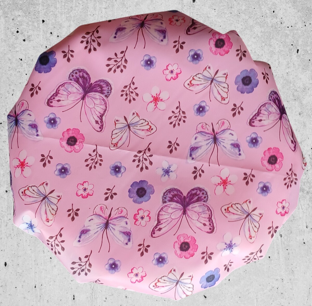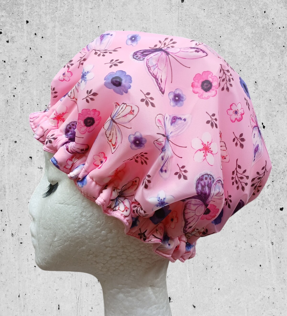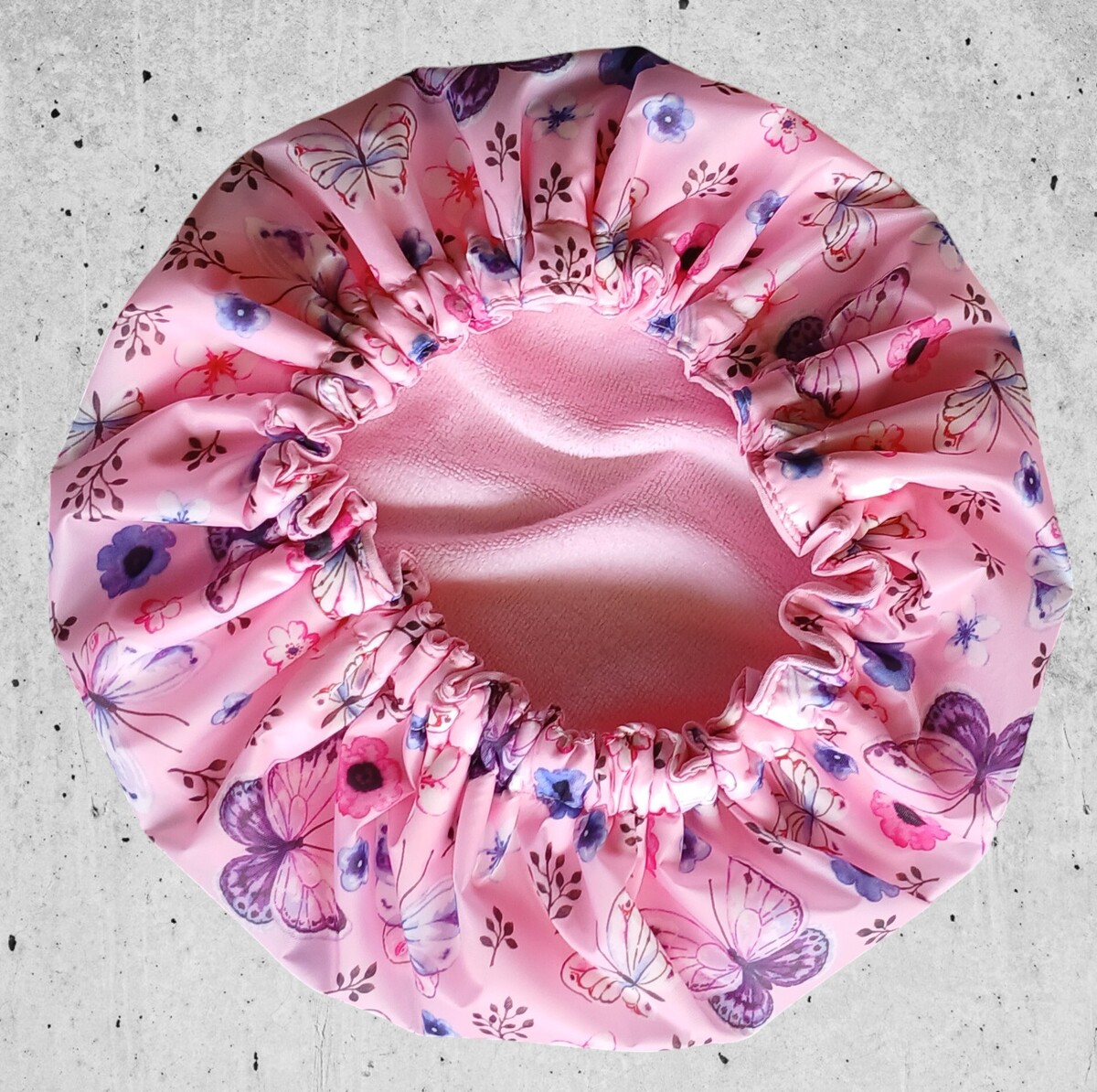 Pretty, So Pretty Butterflies in this delightfully pink and waterproof shower cap! Butterflies of varying sizes are scattered all over this design, along with simple flowers and leaves. Predominantly Pink and Lilac with the leaves in a dark Brown. This shower cap is also lined with Pink Microfibre towelling and also has Pink casing for the elastic internally as well. All very Pink but matches perfectly all round!