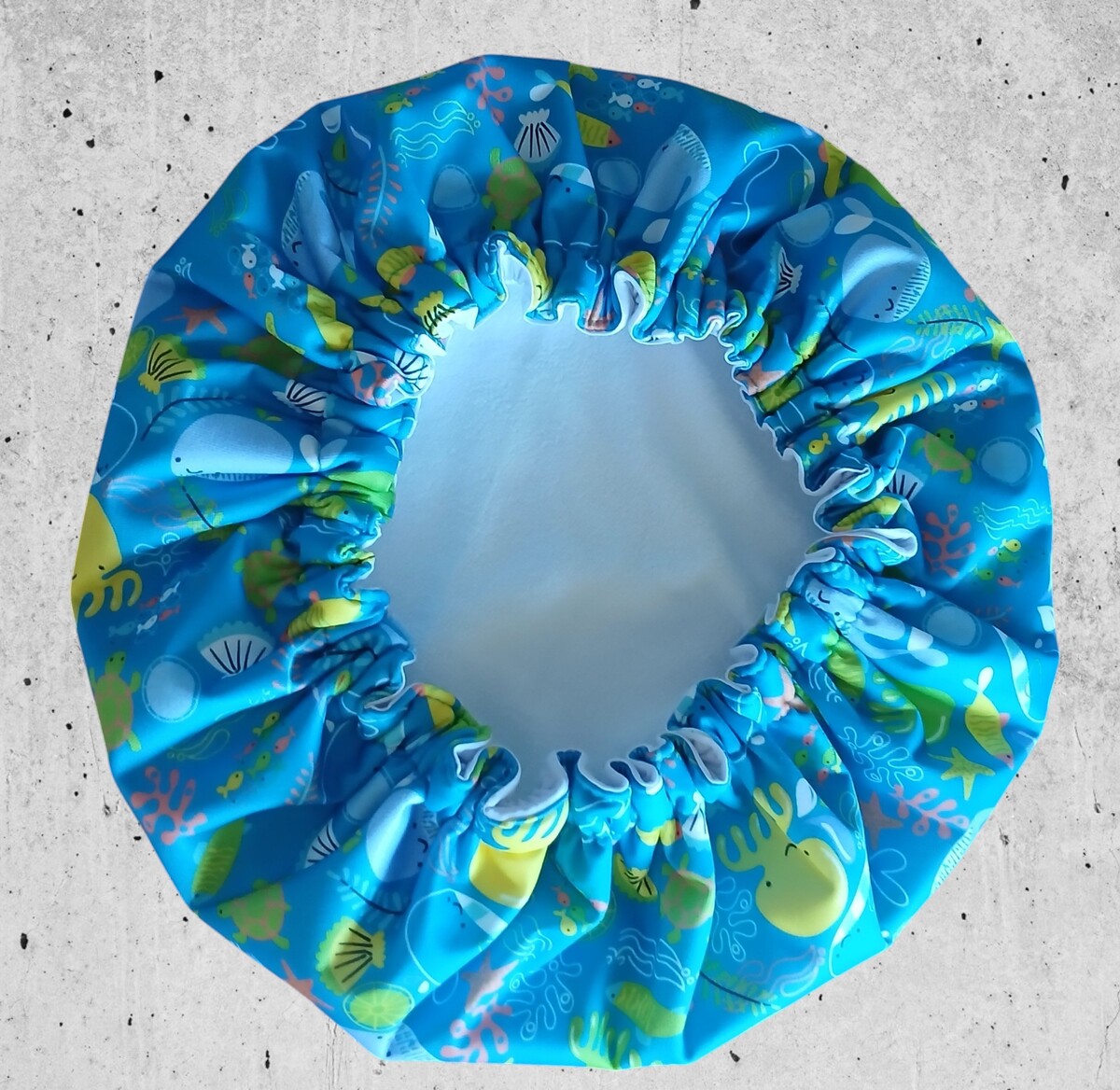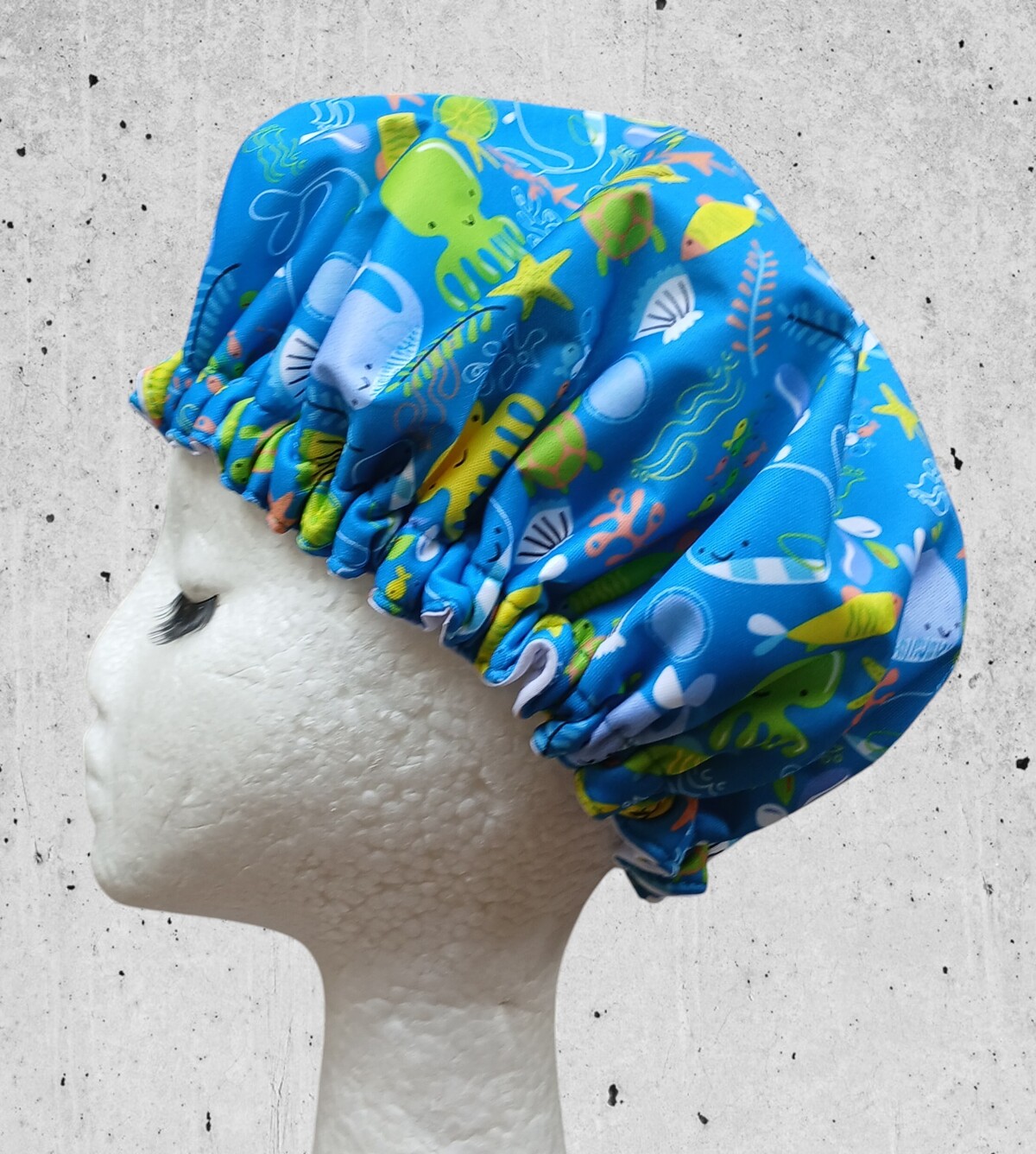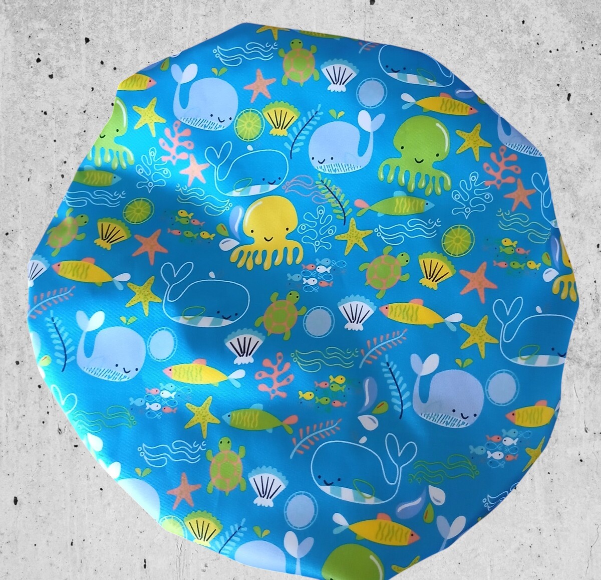 Such a fun and happy ocean themed print this shower cap is! So Pretty Sea Jolie is a very jolly scene indeed, made up of a variety of happy sea creatures such as Whales, Octopus and Fish, then teaming with associated marine themed sea life like starfish, turtles, coral, and shells. There are splashes and waves in amongst the pattern too…all in all a very bright and fun predominantly Aqua and Yellow design that becomes this So Pretty Sea Jolie Shower Cap!