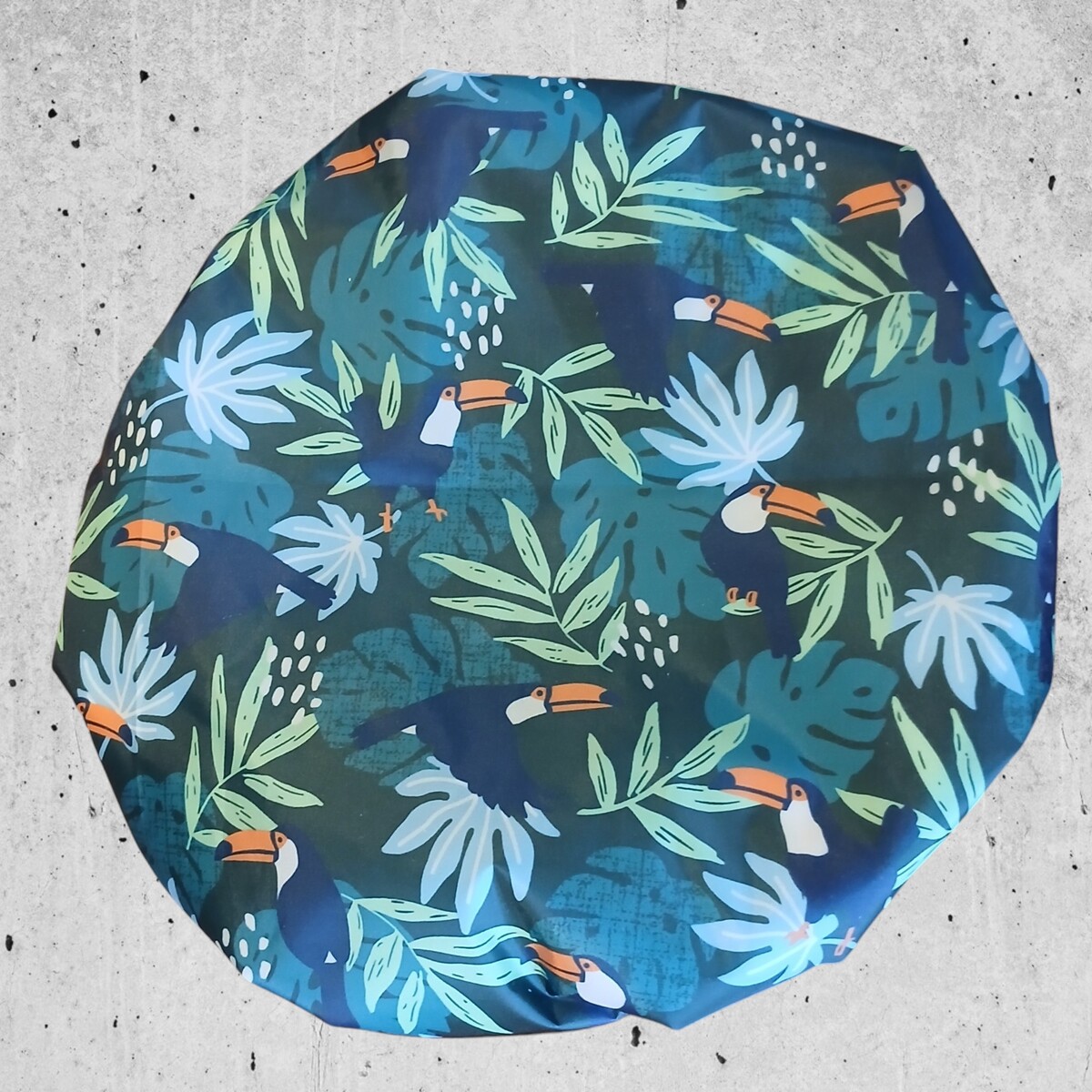Bring a touch of a tropical jungle scene to your bathroom décor with this So Pretty Toucan waterproof shower cap! Predominantly shades of Dark and Light Green palm leaves and scattered with Toucans either flying, sitting or perching. This is a shower cap that may have a variety of suitable candidates to have as a hair accessory of choice! Suggestions could be you are a bird lover, specifically love Toucans, plan to travel somewhere tropical, or simply that this So Pretty design will match your or someone else’s bathroom as a gift!