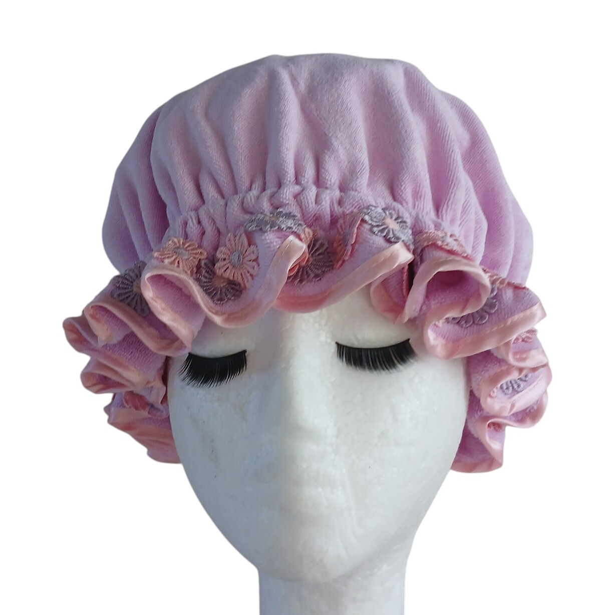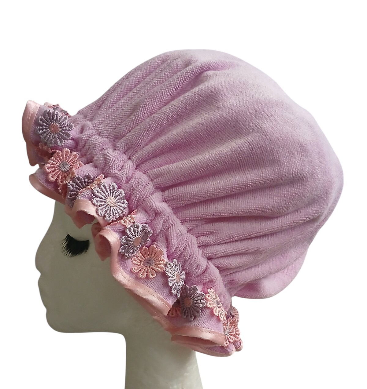 The pretty daisy lace trim on this cap is in a matching pink and lilac to which compliments the pink satin trim edging as well.
