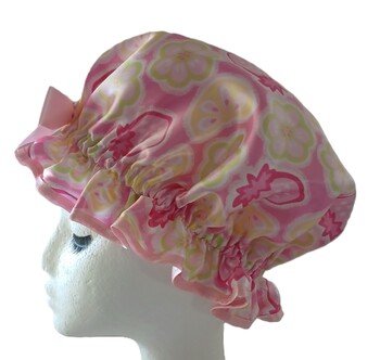 The So Pretty Tutti Frutti print is a combination of strawberries, flowers and fruit segments in an abstract but colourful design mainly focused on various shades of Pink and Lemon. Not over done or too flashy, the standout feature are the Strawberries. This shower cap was nearly called Strawberry Shortcake because of this but obviously it didn’t end up that way! Deciding on a So Pretty name for a shower cap can be quite a process at times. Tutti Frutti in this instance sounds more appealing!